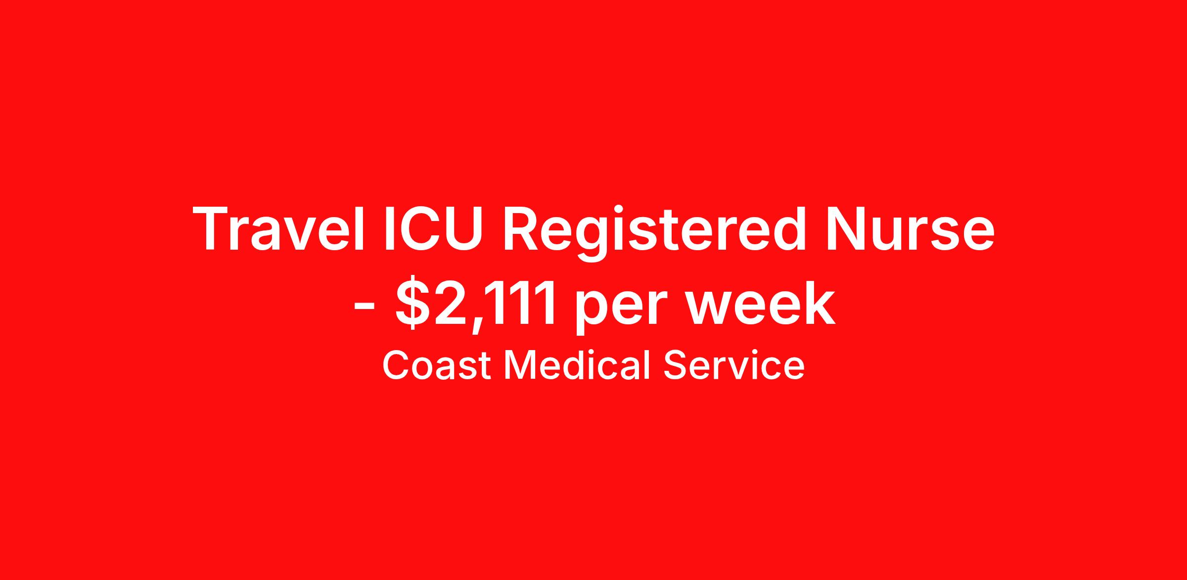 Coast Medical Service is seeking a travel nurse RN ICU - Intensive Care Unit for a travel nursing job in Los Angeles, California. Job Description & Requirements Specialty: ICU - Intensive Care Unit Discipline: RN Start Date: ASAP Duration: 13 weeks 36 hours per week Shift: 12 hours, nights Employment Type: Travel Coast Medical Service is a nationwide travel nursing & allied healthcare staffing agency dedicated to providing an elite traveler experience for the experienced or first-time traveler. Coast is featured on Blue Pipes' 2023 Best Travel Agencies and named a 2022 Top Rated Healthcare Staffing Firm & 2023 First Half Top Rated Healthcare Staffing Firm by Great Recruiters. Please note that pay rate may differ for locally based candidates. Please apply here or contact a recruiter directly to learn more about this position & the facility, and/or explore others that may be of interest to you. We look forward to speaking with you! Coast Medical Services Job ID 36126458. Pay package is based on 12 hour shifts and 36.0 hours per week (subject to confirmation) with tax-free stipend amount to be determined. Posted job title: RN:Intensive Care Unit (ICU),19:00:00-07:30:00