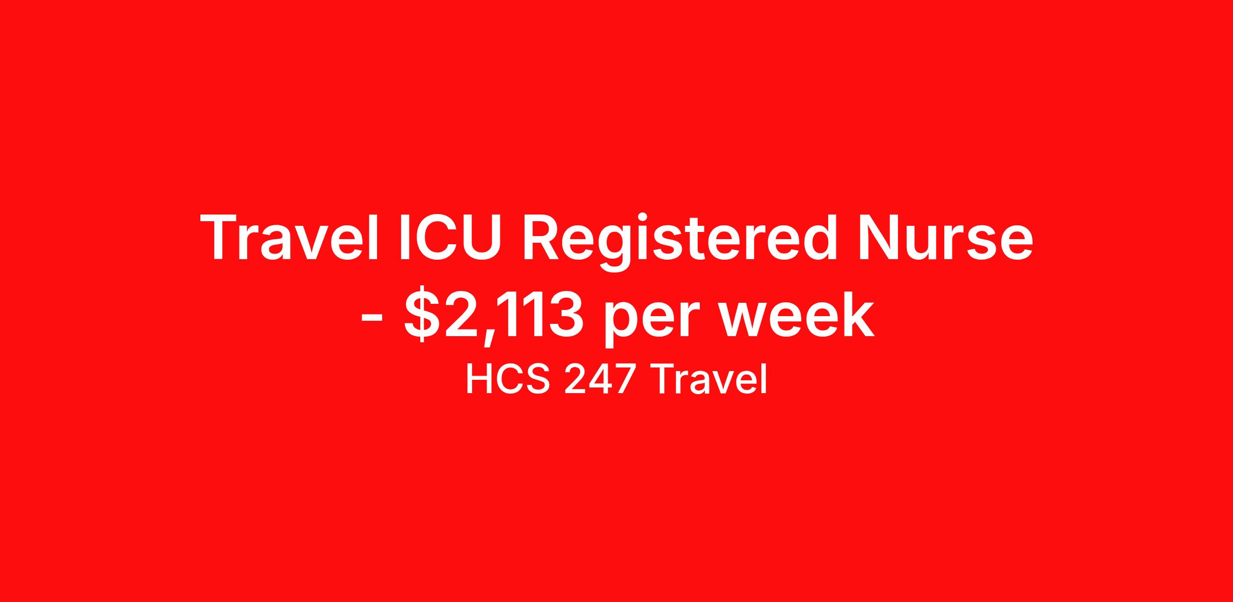 HCS 247 Travel is seeking a travel nurse RN ICU - Intensive Care Unit for a travel nursing job in Asheville, North Carolina. Job Description & Requirements Specialty: ICU - Intensive Care Unit Discipline: RN Start Date: 03/30/2026 Duration: 13 weeks 36 hours per week Shift: 12 hours, nights Employment Type: Travel HCS 247 Travel Job ID 62364207. Pay package is based on 12 hour shifts and 36 hours per week (subject to confirmation) with tax-free stipend amount to be determined. About HCS 247 Travel HCS 24/7 is a national healthcare staffing organization specializing in the placement of Registered Nurses and Allied health professionals across acute care and other clinical settings. We support travel assignments, local short- and long-term contracts, per diem, temp-to-perm, and direct hire opportunities nationwide. Our clinical coverage includes Registered Nurse specialties such as ER, ICU, Med-Surg, Telemetry, Step-Down, OR, PACU, L&D, Mother/Baby, NICU, Cath Lab, Endoscopy, and more along with a full range of allied and imaging professionals, including Respiratory Therapists, Surgical Technicians, X-Ray Techs, CT Techs, MRI Techs, Interventional Radiology (IR) Techs, Cath Lab Techs, Ultrasound/Sonographers, Mammography Techs, and Nuclear Medicine Techs. With competitive compensation and benefits, consistent opportunities, and a clinician-first approach backed by top-rated customer service, HCS 24/7 delivers a seamless experience from initial application through assignment completion. Benefits Holiday Pay Guaranteed Hours Continuing Education Mileage reimbursement Referral bonus Medical benefits Dental benefits Vision benefits License and certification reimbursement Life insurance Benefits start day 1 Weekly pay