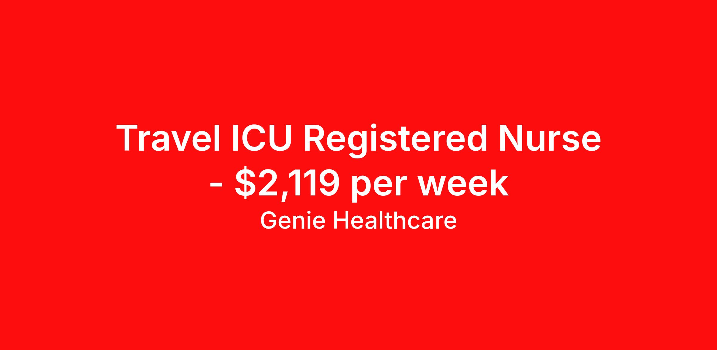 Genie Healthcare is seeking a travel nurse RN ICU - Intensive Care Unit for a travel nursing job in Point Pleasant, West Virginia. Job Description & Requirements Specialty: ICU - Intensive Care Unit Discipline: RN Start Date: 05/18/2026 Duration: 13 weeks 36 hours per week Shift: 12 hours, nights Employment Type: Travel Genie Healthcare is looking for a RN to work in Intensive Care Unit (ICU) for a 13 weeks travel assignment located in Point Pleasant, WV for the Shift (3x12 nights, 19:00:00-07:00:00, 12.00-3). Pay and benefits packages are estimated based on client bill rate at time the job was posted. These rates are subject to change. Exact pay and benefits vary based on several things, including, but not limited to, guaranteed hours, client changes in bill rate, experience, etc. Benefits: Medical Insurance, Dental Insurance, Vision Insurance, 401(k) with company matching (50% up to 6% of what you contribute) Genie Healthcare Job ID 18204659. Pay package is based on 12 hour shifts and 36.0 hours per week (subject to confirmation) with tax-free stipend amount to be determined. Posted job title: RN:Intensive Care Unit (ICU),19:00:00-07:00:00 About Genie Healthcare Genie Healthcare is one of the fastest growing Nurse Travel Agencies in the USA. Genie serves hundreds of facilities and has over 4000 current travel RN contracts open at any given time. Genie provides travel RN’s flexibility, support, top pay scale, housing and the 1 rated, multi-state health insurance coverage. Genie Healthcare carries with it a commitment to providing a comprehensive level of service and quality care. Growing from a small team of eager recruiters to a company with satisfied clients in nearly every corner of the nation, delivering excellence in patient and customer care is the key to Genie’s success. The management team has 20 years of experience in workforce solutions and staffing in medical and non-medical fields, roles ranging from Clerical job to Cardiologist to software developer to CEO.