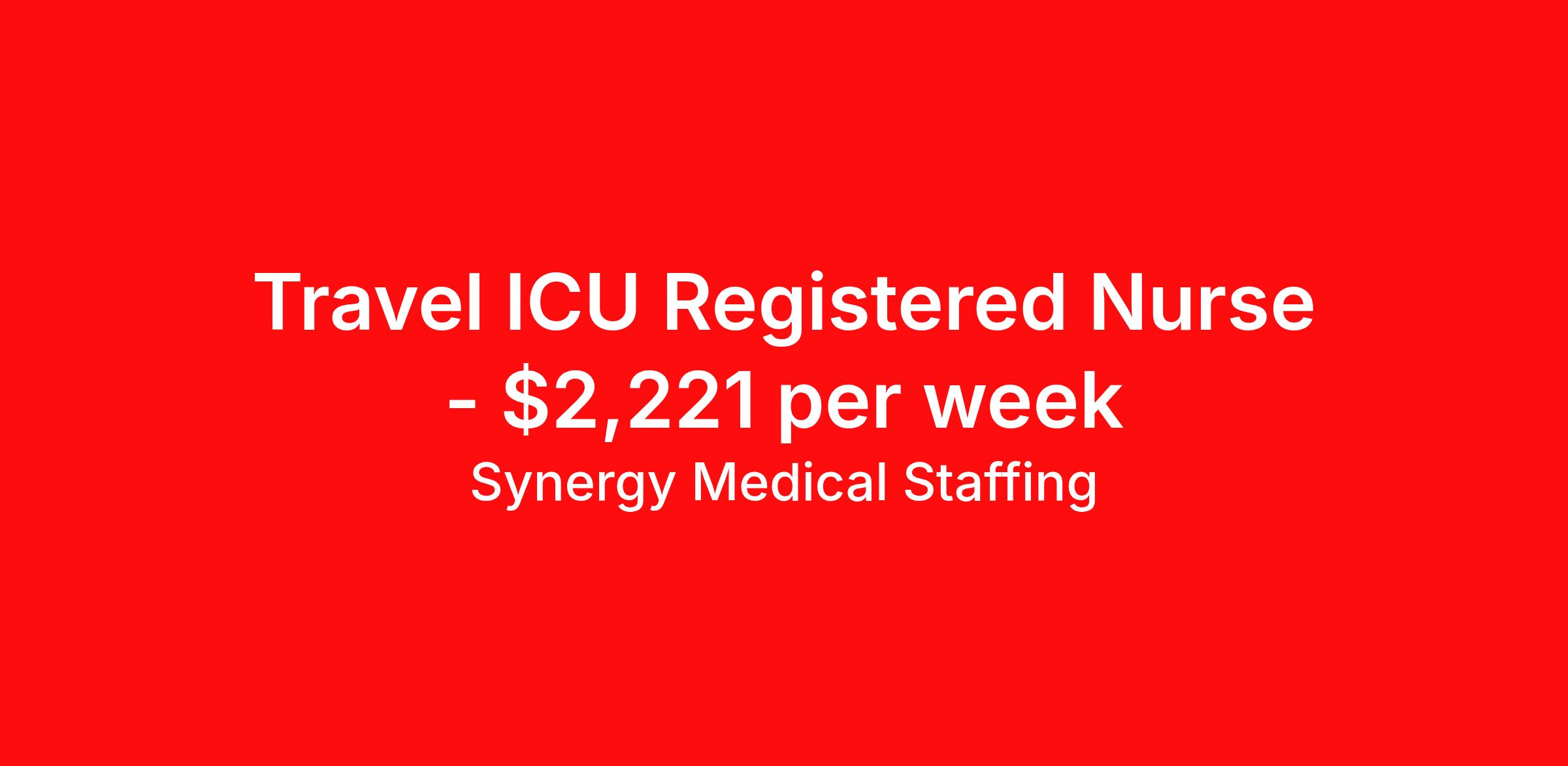 Synergy Medical Staffing is seeking a travel nurse RN ICU - Intensive Care Unit for a travel nursing job in Salem, Massachusetts. Job Description & Requirements Specialty: ICU - Intensive Care Unit Discipline: RN Start Date: 04/19/2026 Duration: 13 weeks 36 hours per week Shift: 12 hours, nights Employment Type: Travel Travel, RN - ICU Location: Salem, Massachusetts Shift: 3X12 Nights, 19:00:00-07:00:00, 12.00-3 Duration 13 Weeks When you join Synergy Medical Staffing, you’ll have a dedicated recruiter helping you at all times. Your recruiter is a cross between a career coach and a concierge. They will help you fine-tune your resume, find your next job, and locate an apartment (even one that takes pets!). Make one call and get help with everything from placement to housing to payroll, even travel directions! As a travel, contract and permanent placement medical staffing company with over 20 years of experience in the industry, we understand your needs. Synergy’s Benefits are best in class and include the following: 401K that matches up to 5% of your pay and you are 100% vested from Day 1. Medical, Dental, Vision, Life insurance, Long and short-term disability and others Loyality Program Weekly pay Holiday Pay (varies by Assignment) Guaranteed Hours (varies by Assignment) Referral bonus Continuing Education License and certification reimbursement Synergy Medical Staffing Job ID 36155733. Pay package is based on 12 hour shifts and 36.0 hours per week (subject to confirmation) with tax-free stipend amount to be determined. Posted job title: RN:ICU,19:00:00-07:00:00 About Synergy Medical Staffing When you join Synergy Medical Staffing, you’ll have a dedicated recruiter helping you at all times. Your recruiter is a cross between a career coach and a concierge. They will help you fine-tune your resume, find your next job, and locate an apartment (even one that takes pets!). Make one call and get help with everything from placement to housing to payroll, even travel directions! As a travel, contract and permanent placement medical staffing company with over 12 years of experience in the industry, we understand your needs. Are you interested in traveling, or just a job around the corner? Whatever your preference, you can be sure there are plenty of Nursing Jobs, Allied Jobs and Physical Therapy Jobs, Occupational Therapy Jobs, Speech Therapy Jobs and Rehab Therapy jobs anywhere you want to go. Synergy Medical Staffing professionals have been in the Medical staffing employment and staffing industry for over 12 years, and have developed solid relationships with numerous healthcare facilities nationwide. Contact us now and expand your medical career with new opportunities from Synergy Medical Staffing. Synergy’s Benefits are best in class and include the following 401K Day 1 Full Medical, Dental, Vision, Life insurance, Long and short term disability and others Student Loan Repayment and CEU reimbursement Loyalty bonus after 600 hours Benefits Discount program Weekly pay Holiday Pay Guaranteed Hours Referral bonus Medical benefits Dental benefits Continuing Education License and certification reimbursement Life insurance 401k retirement plan Cancelation protection Vision benefits