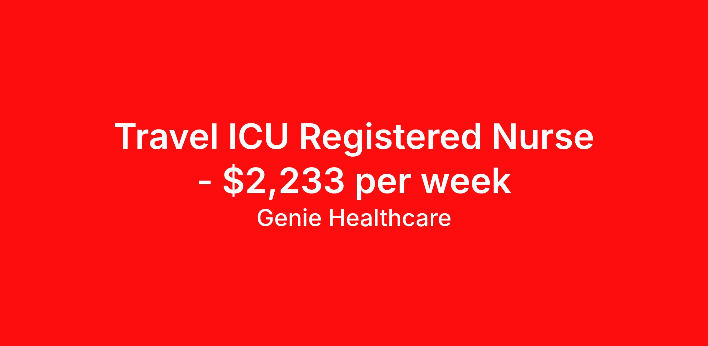 Genie Healthcare is seeking a travel nurse RN ICU - Intensive Care Unit for a travel nursing job in Redding, California. Job Description & Requirements Specialty: ICU - Intensive Care Unit Discipline: RN Start Date: ASAP Duration: 13 weeks 36 hours per week Shift: 12 hours, nights Employment Type: Travel Genie Healthcare is looking for a RN to work in Intensive Care Unit (ICU) for a 13 weeks travel assignment located in Redding, CA for the Shift (3x12 nights, 19:00:00-07:00:00, 12.00-3). Pay and benefits packages are estimated based on client bill rate at time the job was posted. These rates are subject to change. Exact pay and benefits vary based on several things, including, but not limited to, guaranteed hours, client changes in bill rate, experience, etc. Benefits: Medical Insurance, Dental Insurance, Vision Insurance, 401(k) with company matching (50% up to 6% of what you contribute) Genie Healthcare Job ID 17717948. Pay package is based on 12 hour shifts and 36.0 hours per week (subject to confirmation) with tax-free stipend amount to be determined. Posted job title: RN:Intensive Care Unit (ICU),19:00:00-07:00:00 About Genie Healthcare Genie Healthcare is one of the fastest growing Nurse Travel Agencies in the USA. Genie serves hundreds of facilities and has over 4000 current travel RN contracts open at any given time. Genie provides travel RN’s flexibility, support, top pay scale, housing and the 1 rated, multi-state health insurance coverage. Genie Healthcare carries with it a commitment to providing a comprehensive level of service and quality care. Growing from a small team of eager recruiters to a company with satisfied clients in nearly every corner of the nation, delivering excellence in patient and customer care is the key to Genie’s success. The management team has 20 years of experience in workforce solutions and staffing in medical and non-medical fields, roles ranging from Clerical job to Cardiologist to software developer to CEO.