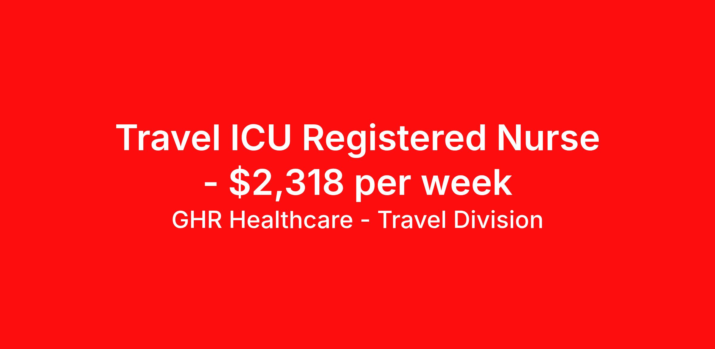 GHR Healthcare - Travel Division is seeking a travel nurse RN ICU - Intensive Care Unit for a travel nursing job in Silvis, Illinois. Job Description & Requirements Specialty: ICU - Intensive Care Unit Discipline: RN Start Date: 03/30/2026 Duration: 12 weeks 36 hours per week Shift: 12 hours Employment Type: Travel GHR Healthcare - Travel Division Job ID 76173276. Pay package is based on 12 hour shifts and 36 hours per week (subject to confirmation) with tax-free stipend amount to be determined. About GHR Healthcare - Travel Division For over 30 years, GHR Healthcare has been the bridge between healthcare professionals and the facilities that need them nationwide. We're committed to uncovering your ideal fit, supported by GHR's dedication to competitive compensation, transparent communication, and a devoted team that genuinely cares about your career journey. You can trust us to stand by your side as your advocate, confidante, and partner in advancing your career. At GHR, care and consideration are at the heart of everything we do. Visit ghrhealthcare.com to learn more.