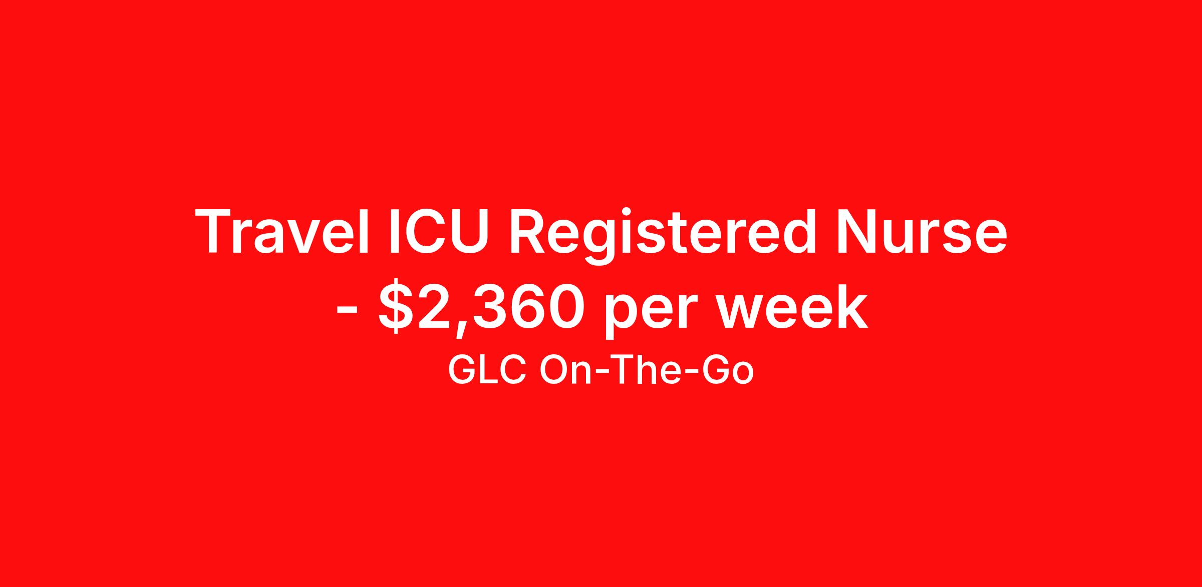 GLC On-The-Go is seeking a travel nurse RN ICU - Intensive Care Unit for a travel nursing job in Albuquerque, New Mexico. Job Description & Requirements Specialty: ICU - Intensive Care Unit Discipline: RN Start Date: 03/30/2026 Duration: 13 weeks 48 hours per week Shift: 12 hours Employment Type: Travel GLC is hiring: RN ICU - Albuquerque, NM - 13-week contract GLC – Named Best Nurse Agency 2024–2025 We connect nurses, nursing professionals, and allied health professionals like you to contracts that align with your skills, schedule, and career goals. About this Assignment Join the care team in ICU where you’ll provide patient-centered care in a collaborative environment. Typical responsibilities include direct patient care, timely documentation, and coordination with the care team. Specific duties will be confirmed during your interview with a recruiter. Assignment Details Location: Albuquerque, NM Assignment Length: 13 weeks Start Date: 03/30/2026 End Date: 06/29/2026 Pay Range: $2,124 - $2,360 Minimum Requirements Active license in ICU 1 year full-time RN, ICU experience within the last 2 years What you can expect from GLC Weekly on-time pay with direct deposit Transparent communication, clear assignment details, and recruiter support from start to finish - or extension Referral bonus up to $500 Health, dental, and vision insurance 401(k) plan Completion and signing bonuses may also be available Ready to move forward? Apply now and start your rewarding journey with GLC - a recruiter will connect quickly to review pay , start date , and assignment details so you can make the best decision for your next contract. GLC On-The-Go Job ID 501167. Pay package is based on 12 hour shifts and 48 hours per week (subject to confirmation) with tax-free stipend amount to be determined. Posted job title: ICU Registered Nurse About GLC On-The-Go GLC is more than just a staffing agency – we’re your trusted partner in finding travel, local, and PRN contracts that align with your career aspirations and lifestyle. We specialize in connecting travel nurses and allied healthcare professionals like you with opportunities in acute care, long-term care, behavioral health, and allied fields across the U.S. Our attentive and friendly recruiters are always just a call or text away, ready to guide you at every step, ensuring you feel valued and heard. We understand the unique needs of travel healthcare professionals, which is why we offer comprehensive benefits and 24/7 support. Join GLC, where our 20 years of experience mean we know how to help you find the assignments that turn your career goals into reality. With us, it's not just a placement – it's your dream career made possible