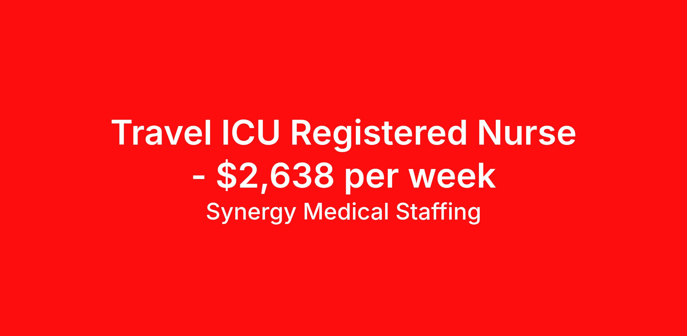 Synergy Medical Staffing is seeking a travel nurse RN ICU - Intensive Care Unit for a travel nursing job in Springfield, Massachusetts. Job Description & Requirements Specialty: ICU - Intensive Care Unit Discipline: RN Start Date: 04/13/2026 Duration: 13 weeks 36 hours per week Shift: 12 hours, nights Employment Type: Travel Travel, RN - ICU Location: Springfield, Massachusetts Shift: 3X12 Nights, 19:00:00-07:00:00, 12.00-3 Duration 13 Weeks When you join Synergy Medical Staffing, you’ll have a dedicated recruiter helping you at all times. Your recruiter is a cross between a career coach and a concierge. They will help you fine-tune your resume, find your next job, and locate an apartment (even one that takes pets!). Make one call and get help with everything from placement to housing to payroll, even travel directions! As a travel, contract and permanent placement medical staffing company with over 20 years of experience in the industry, we understand your needs. Synergy’s Benefits are best in class and include the following: 401K that matches up to 5% of your pay and you are 100% vested from Day 1. Medical, Dental, Vision, Life insurance, Long and short-term disability and others Loyality Program Weekly pay Holiday Pay (varies by Assignment) Guaranteed Hours (varies by Assignment) Referral bonus Continuing Education License and certification reimbursement Synergy Medical Staffing Job ID 36166384. Pay package is based on 12 hour shifts and 36.0 hours per week (subject to confirmation) with tax-free stipend amount to be determined. Posted job title: RN:ICU,19:00:00-07:00:00 About Synergy Medical Staffing When you join Synergy Medical Staffing, you’ll have a dedicated recruiter helping you at all times. Your recruiter is a cross between a career coach and a concierge. They will help you fine-tune your resume, find your next job, and locate an apartment (even one that takes pets!). Make one call and get help with everything from placement to housing to payroll, even travel directions! As a travel, contract and permanent placement medical staffing company with over 12 years of experience in the industry, we understand your needs. Are you interested in traveling, or just a job around the corner? Whatever your preference, you can be sure there are plenty of Nursing Jobs, Allied Jobs and Physical Therapy Jobs, Occupational Therapy Jobs, Speech Therapy Jobs and Rehab Therapy jobs anywhere you want to go. Synergy Medical Staffing professionals have been in the Medical staffing employment and staffing industry for over 12 years, and have developed solid relationships with numerous healthcare facilities nationwide. Contact us now and expand your medical career with new opportunities from Synergy Medical Staffing. Synergy’s Benefits are best in class and include the following 401K Day 1 Full Medical, Dental, Vision, Life insurance, Long and short term disability and others Student Loan Repayment and CEU reimbursement Loyalty bonus after 600 hours Benefits Discount program Weekly pay Holiday Pay Guaranteed Hours Referral bonus Medical benefits Dental benefits Continuing Education License and certification reimbursement Life insurance 401k retirement plan Cancelation protection Vision benefits