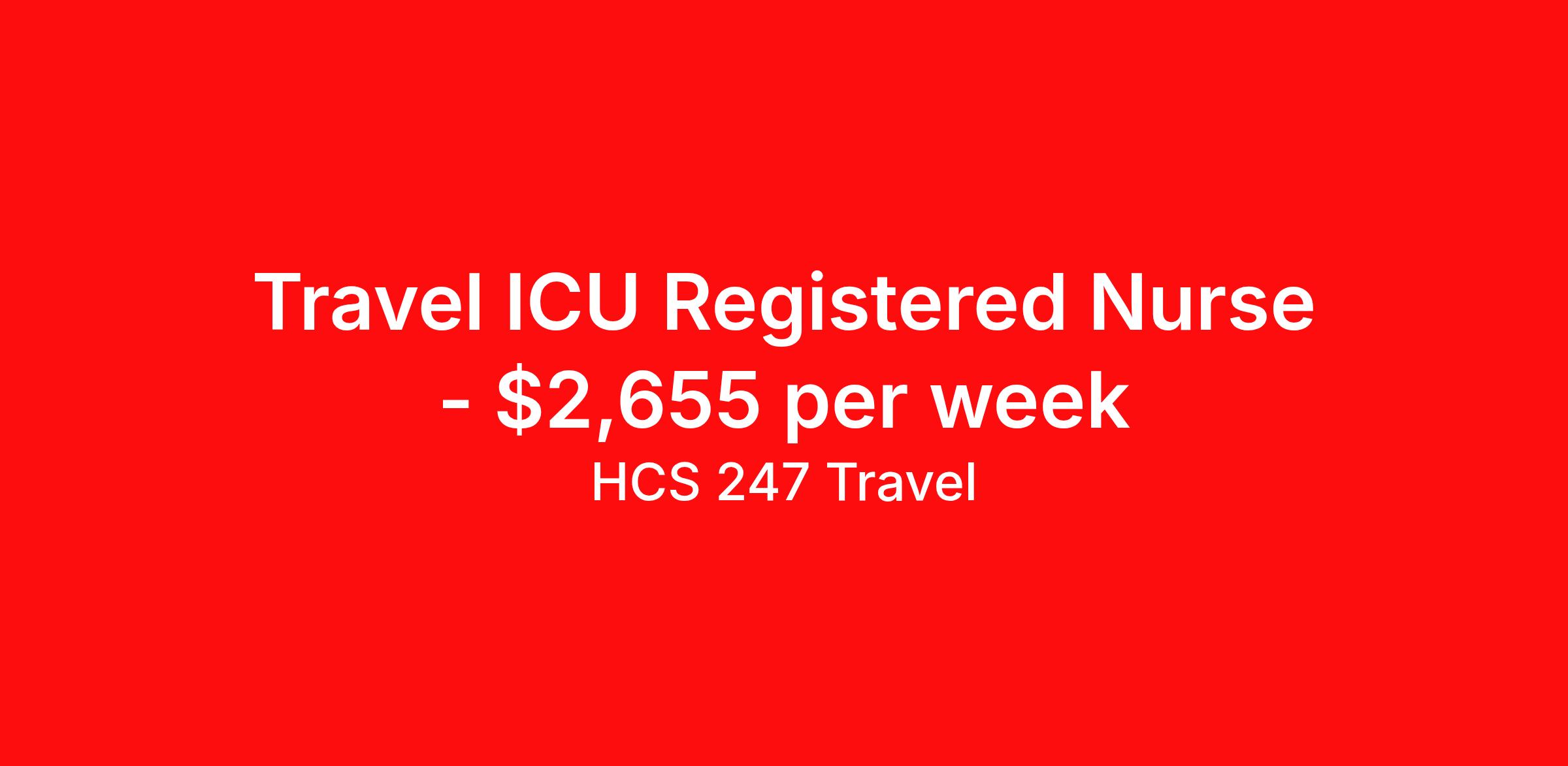 HCS 247 Travel is seeking a travel nurse RN ICU - Intensive Care Unit for a travel nursing job in Springfield, Massachusetts. Job Description & Requirements Specialty: ICU - Intensive Care Unit Discipline: RN Start Date: 04/13/2026 Duration: 13 weeks 36 hours per week Shift: 12 hours, nights Employment Type: Travel HCS 247 Travel Job ID 62474854. Pay package is based on 12 hour shifts and 36 hours per week (subject to confirmation) with tax-free stipend amount to be determined. About HCS 247 Travel HCS 24/7 is a national healthcare staffing organization specializing in the placement of Registered Nurses and Allied health professionals across acute care and other clinical settings. We support travel assignments, local short- and long-term contracts, per diem, temp-to-perm, and direct hire opportunities nationwide. Our clinical coverage includes Registered Nurse specialties such as ER, ICU, Med-Surg, Telemetry, Step-Down, OR, PACU, L&D, Mother/Baby, NICU, Cath Lab, Endoscopy, and more along with a full range of allied and imaging professionals, including Respiratory Therapists, Surgical Technicians, X-Ray Techs, CT Techs, MRI Techs, Interventional Radiology (IR) Techs, Cath Lab Techs, Ultrasound/Sonographers, Mammography Techs, and Nuclear Medicine Techs. With competitive compensation and benefits, consistent opportunities, and a clinician-first approach backed by top-rated customer service, HCS 24/7 delivers a seamless experience from initial application through assignment completion. Benefits Holiday Pay Guaranteed Hours Continuing Education Mileage reimbursement Referral bonus Medical benefits Dental benefits Vision benefits License and certification reimbursement Life insurance Benefits start day 1 Weekly pay