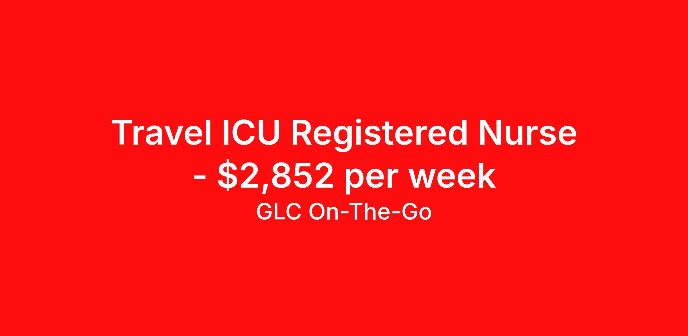 GLC On-The-Go is seeking a travel nurse RN ICU - Intensive Care Unit for a travel nursing job in Metairie, Louisiana. Job Description & Requirements Specialty: ICU - Intensive Care Unit Discipline: RN Start Date: 04/21/2026 Duration: 13 weeks 48 hours per week Shift: 12 hours Employment Type: Travel GLC is hiring: RN ICU - Metairie, LA - 13-week contract GLC – Named Best Nurse Agency 2024–2025 We connect nurses, nursing professionals, and allied health professionals like you to contracts that align with your skills, schedule, and career goals. About this Assignment Join the care team in ICU where you’ll provide patient-centered care in a collaborative environment. Typical responsibilities include direct patient care, timely documentation, and coordination with the care team. Specific duties will be confirmed during your interview with a recruiter. Assignment Details Location: Metairie, LA Assignment Length: 13 weeks Start Date: 04/21/2026 End Date: 07/21/2026 Pay Range: $2,567 - $2,852 Minimum Requirements Active license in ICU 1 year full-time RN, ICU experience within the last 2 years What you can expect from GLC Weekly on-time pay with direct deposit Transparent communication, clear assignment details, and recruiter support from start to finish - or extension Referral bonus up to $500 Health, dental, and vision insurance 401(k) plan Completion and signing bonuses may also be available Ready to move forward? Apply now and start your rewarding journey with GLC - a recruiter will connect quickly to review pay , start date , and assignment details so you can make the best decision for your next contract. GLC On-The-Go Job ID 504837. Pay package is based on 12 hour shifts and 48 hours per week (subject to confirmation) with tax-free stipend amount to be determined. Posted job title: ICU Registered Nurse About GLC On-The-Go GLC is more than just a staffing agency – we’re your trusted partner in finding travel, local, and PRN contracts that align with your career aspirations and lifestyle. We specialize in connecting travel nurses and allied healthcare professionals like you with opportunities in acute care, long-term care, behavioral health, and allied fields across the U.S. Our attentive and friendly recruiters are always just a call or text away, ready to guide you at every step, ensuring you feel valued and heard. We understand the unique needs of travel healthcare professionals, which is why we offer comprehensive benefits and 24/7 support. Join GLC, where our 20 years of experience mean we know how to help you find the assignments that turn your career goals into reality. With us, it's not just a placement – it's your dream career made possible
