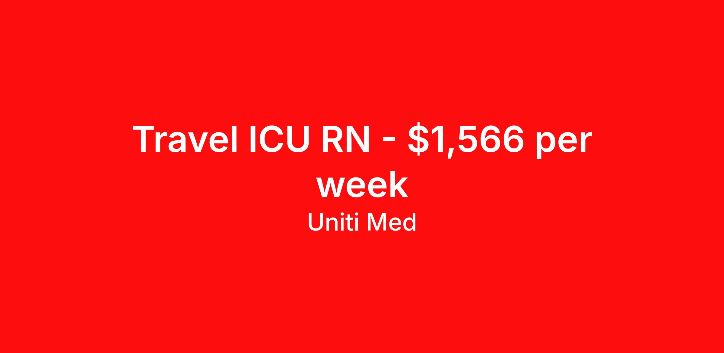 Uniti Med is seeking a travel nurse RN ICU - Intensive Care Unit for a travel nursing job in Gadsden, Alabama. Job Description & Requirements Specialty: ICU - Intensive Care Unit Discipline: RN Start Date: 04/13/2026 Duration: 13 weeks 36 hours per week Shift: 12 hours, nights Employment Type: Travel Benefits: Day 1 Insurance Cigna medical, MetLife dental and vision insurance License reimbursement for new licenses needed for each assignment Discounts with hotels and rental cars A dedicated recruiter and support team that will help you every step of the way to sure you start on time and have an exceptional experience Referral bonus up to $700 About the Company: Finding the right role is about more than just matching skills to a job—it’s about aligning with your goals, values, and the way you want to work. As an award-winning talent partner, we support healthcare professionals through every step of that process, offering meaningful opportunities, clear guidance, and long-term partnership. From our first conversation to your first day on the job (and beyond!), we’re here to help you move forward with confidence. UnitiMed Job ID 789350. Pay package is based on 12 hour shifts and 36 hours per week (subject to confirmation) with tax-free stipend amount to be determined. Posted job title: Registered Nurse (RN) About Uniti Med Uniti Med meticulously matches your talents to our open needs to ensure the ultimate travel experience. Tell us where you want to go and let our experienced staff lead the way! Benefits Referral bonus Benefits start day 1 Employee assistance programs