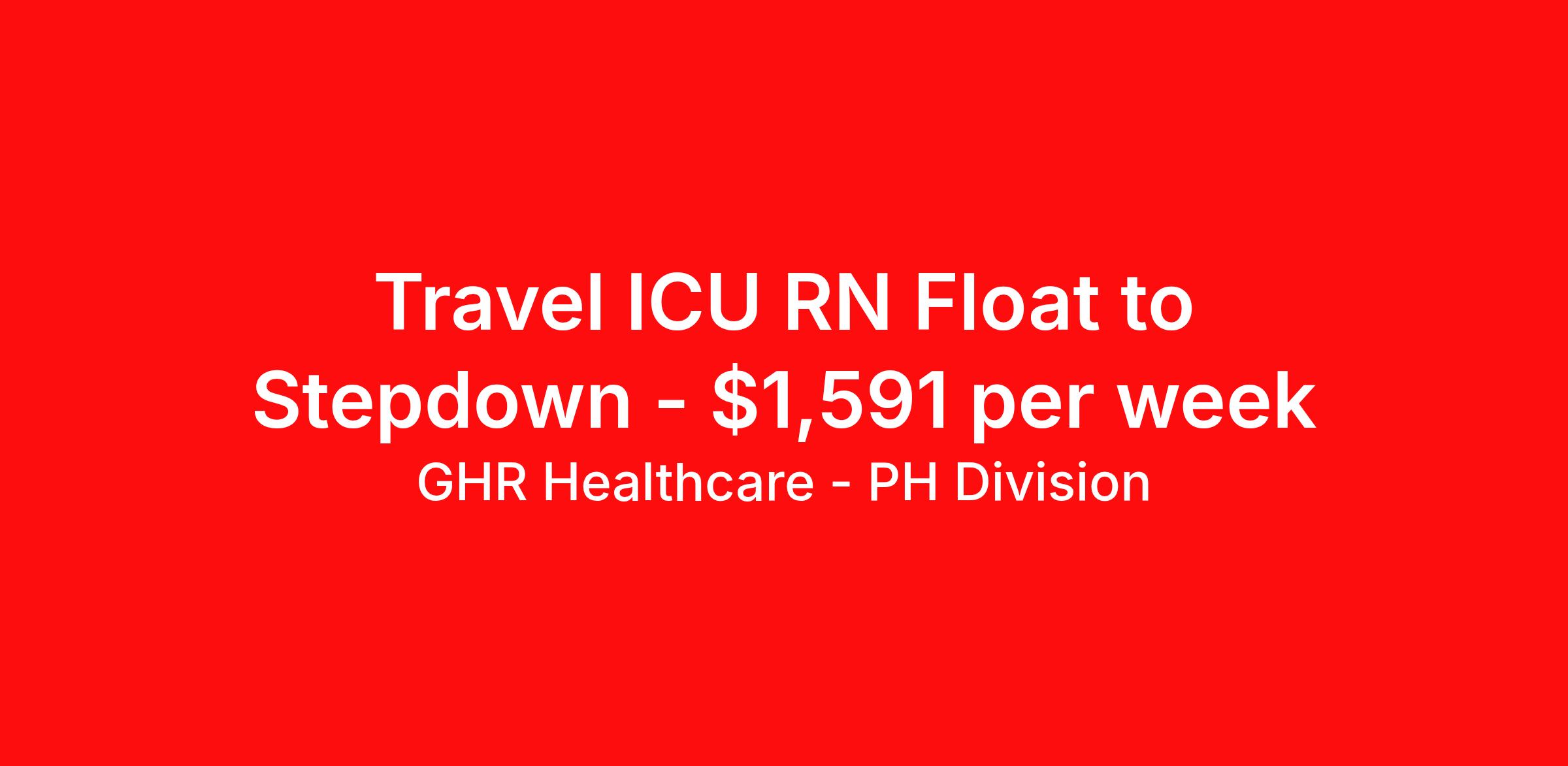 GHR Healthcare - PH Division is seeking a travel nurse RN ICU - Intensive Care Unit for a travel nursing job in Lufkin, Texas. Job Description & Requirements Specialty: ICU - Intensive Care Unit Discipline: RN Start Date: 04/20/2026 Duration: 12 weeks 36 hours per week Shift: 12 hours Employment Type: Travel Planet Healthcare Job ID 76410164. Pay package is based on 12 hour shifts and 36 hours per week (subject to confirmation) with tax-free stipend amount to be determined. About GHR Healthcare - PH Division For over 30 years, GHR Healthcare has been the bridge between healthcare professionals and the facilities that need them nationwide. We're committed to uncovering your ideal fit, supported by GHR's dedication to competitive compensation, transparent communication, and a devoted team that genuinely cares about your career journey. You can trust us to stand by your side as your advocate, confidante, and partner in advancing your career. At GHR, care and consideration are at the heart of everything we do. Visit ghrhealthcare.com to learn more.