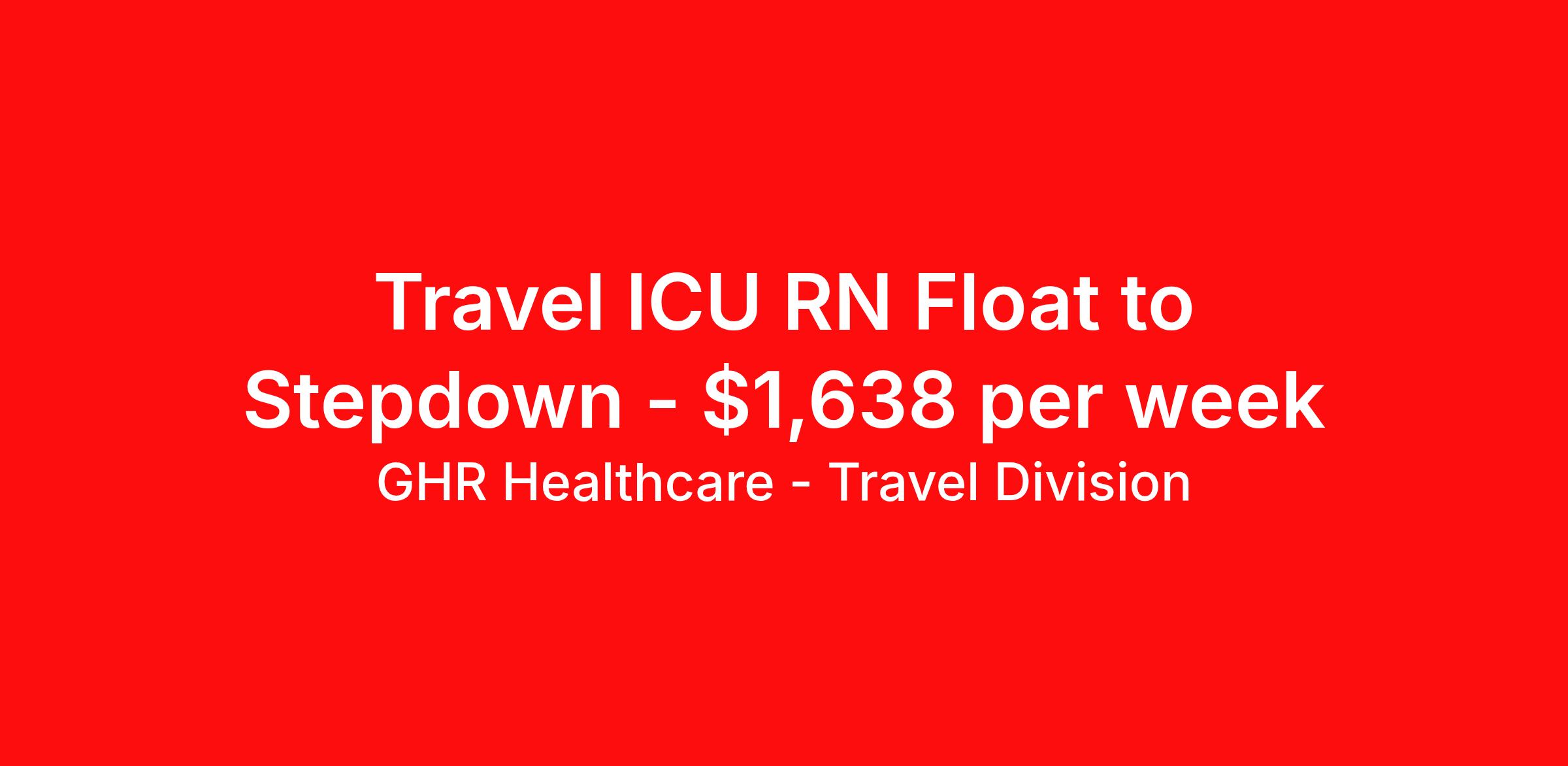 GHR Healthcare - Travel Division is seeking a travel nurse RN ICU - Intensive Care Unit for a travel nursing job in Lufkin, Texas. Job Description & Requirements Specialty: ICU - Intensive Care Unit Discipline: RN Start Date: 04/20/2026 Duration: 12 weeks 36 hours per week Shift: 12 hours Employment Type: Travel GHR Healthcare - Travel Division Job ID 76410164. Pay package is based on 12 hour shifts and 36 hours per week (subject to confirmation) with tax-free stipend amount to be determined. About GHR Healthcare - Travel Division For over 30 years, GHR Healthcare has been the bridge between healthcare professionals and the facilities that need them nationwide. We're committed to uncovering your ideal fit, supported by GHR's dedication to competitive compensation, transparent communication, and a devoted team that genuinely cares about your career journey. You can trust us to stand by your side as your advocate, confidante, and partner in advancing your career. At GHR, care and consideration are at the heart of everything we do. Visit ghrhealthcare.com to learn more.