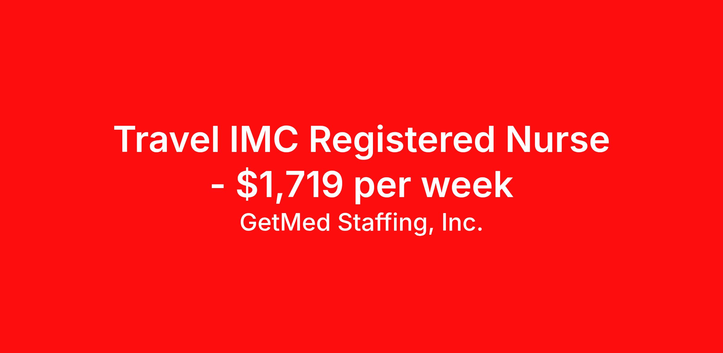 GetMed Staffing, Inc. is seeking a travel nurse RN Intermediate Care for a travel nursing job in Leonardtown, Maryland. Job Description & Requirements Specialty: Intermediate Care Discipline: RN Start Date: 04/13/2026 Duration: 13 weeks 36 hours per week Shift: 12 hours, days Employment Type: Travel GetMed Staffing is searching for a strong Intermediate Care RN to assist our traveler-friendly client. A minimum of 1-2 years of experience is required. Traveling with GetMed Staffing offers the unique opportunity to gain diverse experiences, both personally and professionally. Gain experience that matters. GetMed Staffing, Inc. Job ID 36054529. Pay package is based on 12 hour shifts and 36.0 hours per week (subject to confirmation) with tax-free stipend amount to be determined. Posted job title: RN:IMC,07:00:00-19:00:00 About GetMed Staffing, Inc. We are a diversity owned company, specializing in healthcare recruiting services. We truly understand how important a healthcare travelers' relationship is with their recruiter, as well as our relationship is with our healthcare facilities. We recognize that the needs of our healthcare travelers can vary, and therefore we provide the personalized touch necessary to ensure a successful travel assignment each and every time. Our healthcare facilities and clients benefit from us putting our healthcare travelers first. GetMed Staffing is excited to be a leader within the industry by focusing on providing healthcare travelers with more choices and possibilities as they plan for their next healthcare travel assignment. Benefits Life insurance Medical benefits Dental benefits Vision benefits 401k retirement plan