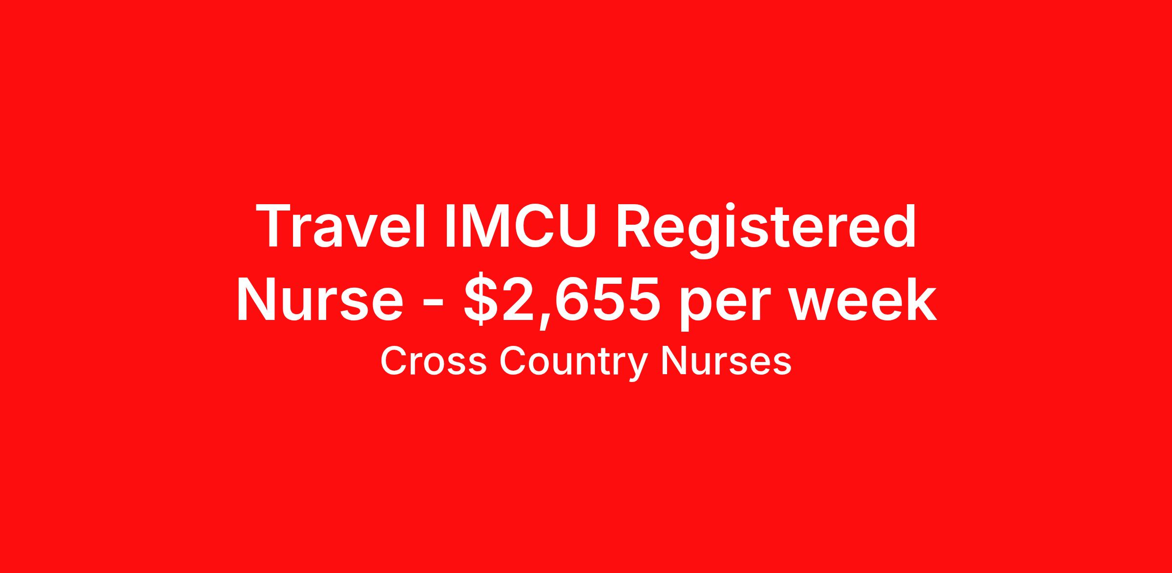 Cross Country Nurses is seeking a travel nurse RN Intermediate Care for a travel nursing job in Burlington, Vermont. Job Description & Requirements Specialty: Intermediate Care Discipline: RN Start Date: 05/18/2026 Duration: 16 weeks 36 hours per week Shift: 12 hours, days, nights Employment Type: Travel Job Description As a registered nurse - intermediate care unit (RN IMC), you will help manage the care for patients who may be experiencing severe, but usually not life-threatening health issues which require moderately complex assessment, moderately intensive therapies and interventions, while not quite requiring the resources of the intensive care unit. Minimum Requirements At least 1 year of recent acute care experience in specialty Active RN license Benefits The benefits of taking a travel nursing job with Cross Country include: Private housing or generous housing allowance Comprehensive health insurance with prescription coverage Dependent health insurance with prescription coverage Competitive salaries Referral bonuses Travel reimbursement 401(k) retirement plan Direct deposit/free checking Unlimited free CE credits Cross Country Job ID 1233482. Pay package is based on 12 hour shifts and 36 hours per week (subject to confirmation) with tax-free stipend amount to be determined. Posted job title: Registered Nurse / Intermediate Care Unit About Cross Country Nurses You care for others — we’re here to care for you. At Cross Country, we know travel nursing is about more than just the job. It’s about building a career that supports your lifestyle, your values, and your impact. We offer competitive pay, full benefits, and 24/7 support from a team that truly understands what it means to be on the front lines. Wherever your journey takes you, we’re with you every step of the way. Let’s build your best life — one assignment at a time. Benefits 401k retirement plan Referral bonus