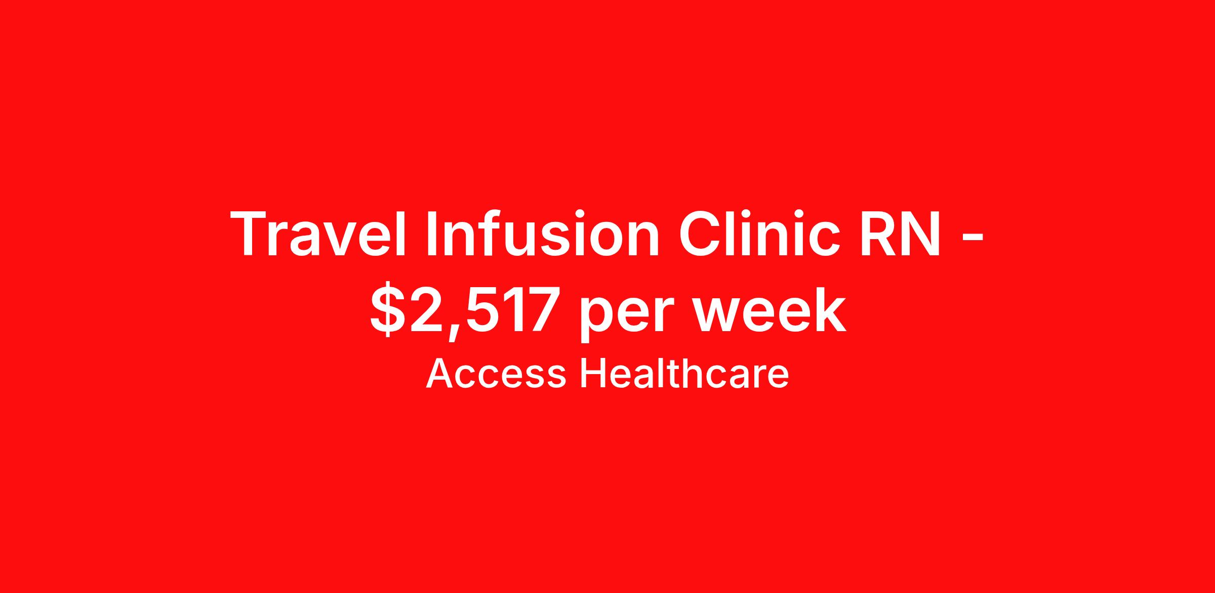 Access Healthcare is seeking a travel nurse RN Clinic Infusion for a travel nursing job in Glenwood Springs, Colorado. Job Description & Requirements Specialty: Infusion Discipline: RN Start Date: 03/31/2026 Duration: 13 weeks 38 hours per week Shift: 12 hours, days Employment Type: Travel Access Healthcare Job ID 76311781. Pay package is based on 12 hour shifts and 38 hours per week (subject to confirmation) with tax-free stipend amount to be determined. About Access Healthcare Access Healthcare aims to provide superior service to our nursing family by providing around the clock support, competitive pay packages and an unmatched benefits package! Unlike other agencies, we offer a true family feel and work with you to find the placement that is right for you. We offer one of the top leading pay packages in the industry and we are ready to get you the money you deserve! Access Healthcare was founded by two travel nurses, Danielle and Diego, who had a dream and a shared vision of creating an agency which all nurses would want to work with. Our passion has led us to where we are today as one of the top 10 agencies in our home state of New Jersey, with access to contracts in all 50 states! We encourage you to join our team and we cannot wait to get to know you!