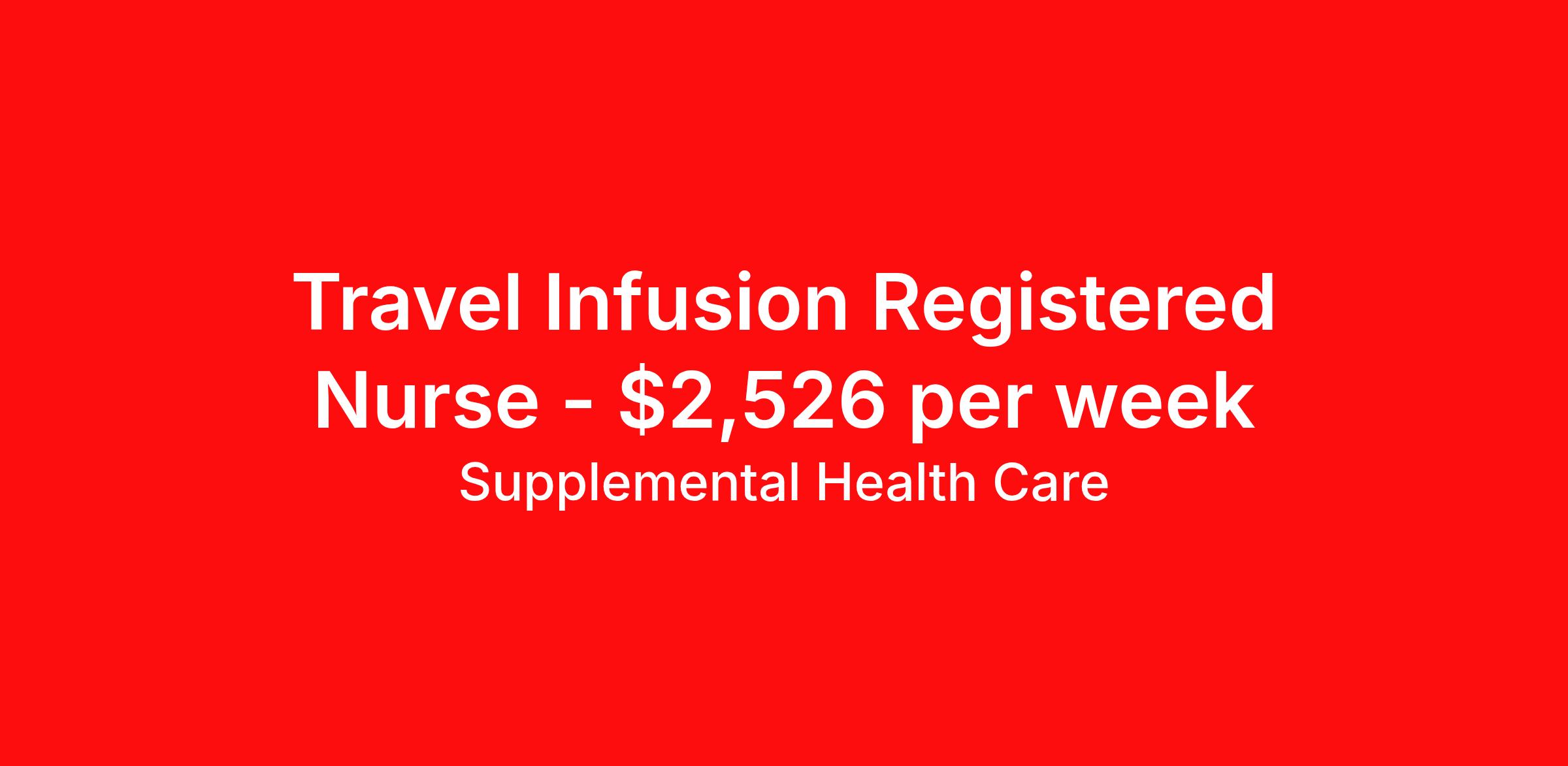 Supplemental Health Care is seeking a travel nurse RN Infusion for a travel nursing job in Grayling, Michigan. Job Description & Requirements Specialty: Infusion Discipline: RN Start Date: ASAP Duration: 13 weeks 40 hours per week Shift: 8 hours, days Employment Type: Travel Job Description: Supplemental Health Care is hiring Infusion RNs for contract assignments at partnering hospitals in Grayling, Michigan. Whether you’re looking to travel or stay local, we’re committed to helping Infusion Registered Nurses find the right fit with top hospitals across the country. With more than 40 years of experience in healthcare staffing, Supplemental Health Care offers reliable support, competitive pay, and great benefits every step of the way. Qualifications: Michigan RN License Certification: Oncology Provider Card (from ONS) American Health Association BLS 2 years of recent Infusion nursing experience Infusion RN Contract Details: $2,340 - $2,526 per week* AM shift available 13-week contract with possibility to extend Infusions, phlebotomy, starting IVs, and port access Duties: primarily responsible for administering intravenous (IV) medications and fluids to patients, closely monitoring them for any adverse reactions throughout the infusion process, and providing necessary supportive care, including patient education about their treatment and potential side effects; this often involves specialized knowledge of various medications like chemotherapy drugs and a high level of skill in IV access placement and management. Typically, these contracts are Monday - Friday schedule *Estimated weekly payment may include both taxable wages and tax-free reimbursements for meals, housing, and incidentals. Please speak with a recruiter for details. Apply today to get started with this Infusion RN contract opportunity, or talk to our team about the full range of Registered Nurse opportunities available. What We Offer: Full medical, dental, vision, life, and even pet insurance! Round the clock support. No matter where you are or what time it is, Supplemental Health Care is standing by. SHC's Share the Care referral program is the most dynamic, profitable referral program in the industry. 401(k) Retirement Savings Program with a wide range of investment options. Discounted and free online access to CEU courses through Supplemental University. Supplemental Health Care is an Equal Opportunity Employer. All candidates, including veterans and those with disabilities, are encouraged to apply. SHC will consider for employment qualified applicants with criminal histories in a manner consistent with the requirements of applicable local, state, or federal law. To learn more, visit www.shccares.com/eeo Supplemental Health Care Job ID 1469417. Pay package is based on 8 hour shifts and 40 hours per week (subject to confirmation) with tax-free stipend amount to be determined. Posted job title: Registered Nurse – Infusion RN About Supplemental Health Care At Supplemental Health Care, a simple belief in the power of caring guides a unique commitment to world-class service in healthcare staffing. For 40 years, we’ve supported talented professionals pursuing their life calling in hospitals, schools, home health, corrections, behavioral health, and other settings. At SHC, we inspire vital connections and enrich lives and inspire better outcomes. As recipients of the Best in Staffing Awards for both Client and Talent, Supplemental Health Care is proud to be among only 2% of staffing companies singled out for the distinction based on the real feedback of our employees and the clients we serve. SHC has also earned The Joint Commission’s Gold Seal of Approval and is named among the Largest Health Care Staffing companies in the United States by Staffing Industry Analysts. We are also thrilled to recognize our very own SLP, Dr. Kelly Byrd as the American Staffing Association 2024 National Staffing Employee of the Year and Health Care Sector All-Star. We’re honored to connect Dr. Byrd to employment, share her incredible story, and support her family literacy nonprofit. For everyone that we serve, SHC is the place where caring hearts thrive. Benefits Referral bonus Benefits start day 1 401k retirement plan Continuing Education Discount program Health savings account