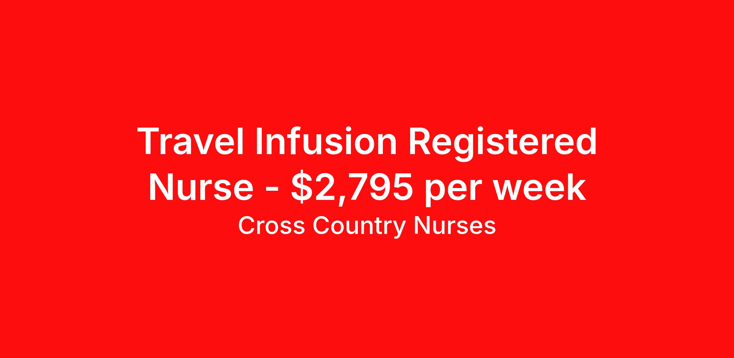 Cross Country Nurses is seeking a travel nurse RN Infusion for a travel nursing job in Gaylord, Michigan. Job Description & Requirements Specialty: Infusion Discipline: RN Start Date: 03/30/2026 Duration: 13 weeks 40 hours per week Shift: 8 hours, days Employment Type: Travel Job Description As a registered nurse (RN), you will provide care for patients dealing with illness or injury. Depending on your role, you'll work at a hospital, outpatient center, private practice, home health, telemedicine, nursing facility, clinic or other facility. You'll perform tasks like assessing patients, developing care plans, administering medication, providing treatment, assisting with surgery, changing bandages, monitoring vitals and maintaining records. You'll also provide continued support and education to patients, promoting their overall health and ensuring they have the tools to recover and prevent further health issues. Minimum Requirements At least 1 year of recent acute care experience in specialty Active RN license Benefits The benefits of taking a travel nursing job with Cross Country include: Private housing or generous housing allowance Comprehensive health insurance with prescription coverage Dependent health insurance with prescription coverage Competitive salaries Referral bonuses Travel reimbursement 401(k) retirement plan Direct deposit/free checking Unlimited free CE credits Cross Country Job ID 1232583. Pay package is based on 8 hour shifts and 40 hours per week (subject to confirmation) with tax-free stipend amount to be determined. Posted job title: Registered Nurse / Infusion About Cross Country Nurses You care for others — we’re here to care for you. At Cross Country, we know travel nursing is about more than just the job. It’s about building a career that supports your lifestyle, your values, and your impact. We offer competitive pay, full benefits, and 24/7 support from a team that truly understands what it means to be on the front lines. Wherever your journey takes you, we’re with you every step of the way. Let’s build your best life — one assignment at a time. Benefits 401k retirement plan Referral bonus