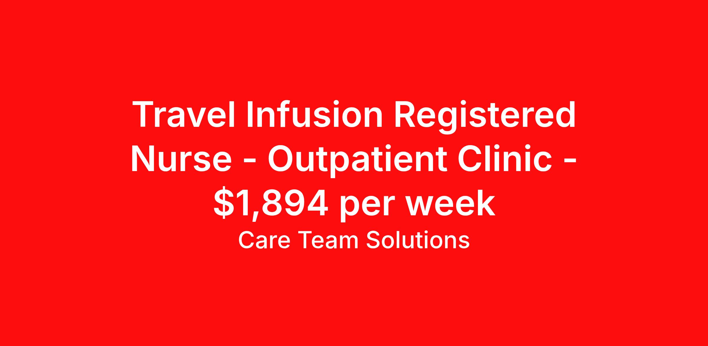 Care Team Solutions is seeking a travel nurse RN Infusion for a travel nursing job in Mount Pleasant, South Carolina. Job Description & Requirements Specialty: Infusion Discipline: RN Start Date: 04/06/2026 Duration: 13 weeks 40 hours per week Shift: 8 hours Employment Type: Travel Registered Nurse must have 2 years of recent experience in particular specialty Details: Must Have 2 Years of recent Oncology experience. Specialty: Oncology Discipline: Registered Nurse Start Date: 2026-04-06 Duration: 13 Weeks Shift: 8 Hours Day shift Hours Per Week: 40 Hours Employment Type: Contract Gross Weekly Pay: $1893.91 Six things that won’t happen if you apply to this job: You won’t have to guess what the downsides are. We’ll tell you up front. You won’t show up on day 1 and find out this is not what you signed up for. We won't leave your phone call ringing when it's inconvenient. Business hours for you are business hours for us. You won’t get shuffled to some customer service rep when a problem pops up. If we screw up something in securing your placement, we'll own it. That means it's on us to make it right. You won’t figure out your credentials alone. Our credentialing experts will walk you through it step by step. We've talked to thousands of travel nurses like you. We know you want good pay. You want to choose when you work. But the one thing nurse after nurse has said they want and don't have is someone in their corner. There's a lot in this business that’s messed up. We’re trying to be the people that fix it. You and every nurse with the guts to travel deserve it. We've worked hard for you to enjoy some one-of-a-kind benefits you'll not likely find anywhere else, because they benefit you more than they benefit us: Our early pay program Student loan reimbursement Free well-being tele-visits with a psychologist Care Team Solutions Job ID 586869. Pay package is based on 8 hour shifts and 40 hours per week (subject to confirmation) with tax-free stipend amount to be determined. Posted job title: Chemo Registered Nurse About Care Team Solutions Two brothers who give an enormous damn. We're Justin and Kyle. Neither of us are nurses. It doesn’t take a nurse to see that the way travel nurses are treated sucks. Nursing is already hard enough. Travel nursing takes serious guts. You get the toughest assignments in places you’ve never been. Which can be fun, but it’s also stressful. You’re in your element but outside of your hometown. You can be a stranger on the team. If anyone deserves someone in their corner, it’s you. But that’s not how most agencies operate. Which is why travel nurses hate working with them. We got into this business because we saw bucket-loads of nurses moving through the "churn and burn" travel machinery. We absolutely hate that. You'll do your best work when you have the placements you want and feel fully supported in your work. We pay our people well because we want them to treat you well. Our recruiters are amazing (we picked each of them ourselves), but if you've got a problem too big for them, they can come straight to us. We work like ten feet away. The "Churners and Burners" promise you the same benefits. They might as well copy/paste them from each other. We have them too: 401k, holiday pay, healthcare, dental, travel reimbursement, etc But we've worked hard for you to enjoy some one-of-a-kind benefits you'll not likely find anywhere else, because they benefit you more than they benefit us: Our early pay program Student loan reimbursement Free well-being tele-visits with a psychologist Benefits Weekly pay Holiday Pay Guaranteed Hours 401k retirement plan Wellness and fitness programs Referral bonus Medical benefits Dental benefits Vision benefits School loan reimbursement