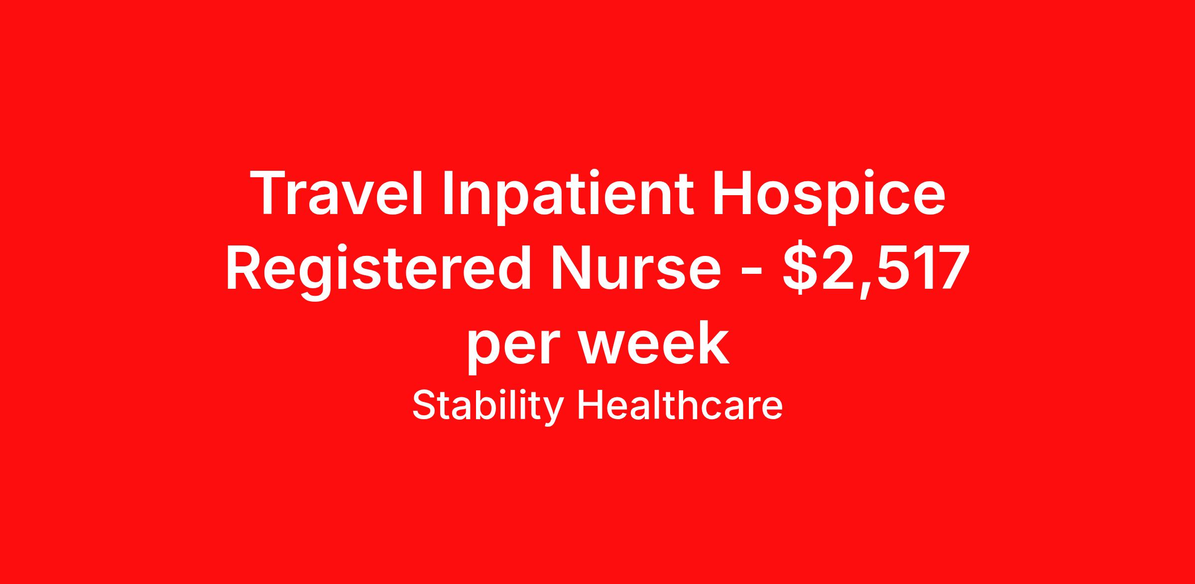 Stability Healthcare is seeking a travel nurse RN Hospice for a travel nursing job in Washington, District of Columbia. Job Description & Requirements Specialty: Hospice Discipline: RN Duration: 13 weeks 40 hours per week Shift: 8 hours, days Employment Type: Travel Stability Healthcare is looking for a Hospice RN contract position in Washington, DC. They work in hospice facilities, nursing homes, hospitals, or patients' homes to provide comfort, pain management, and emotional support to both the patient and their family members. Hospice registered nurses assess patients' conditions, monitor vital signs, administer medications, and collaborate with other healthcare professionals to develop and implement patient care plans. They also provide education and counseling to patients and their families about end-of-life care, grief and loss, and other related topics. *$600 travel bonus *Day 1 health insurance with United Healthcare *PTO plan start accruing on day 1, use during contract or cash out at the end! *Guaranteed stipend if facility calls you off *Extra hour bonus earn an additional hourly bonus for working over your weekly contracted hours Stability Job ID 821161. Pay package is based on 8 hour shifts and 40 hours per week (subject to confirmation) with tax-free stipend amount to be determined. Posted job title: Hospice About Stability Healthcare Stability Healthcare was founded in 2009, with the mission of becoming the best Travel Nursing Agency in California. We have been rated one of the top travel nursing agencies and offer our nurses the highest paying travel nursing jobs available. We have access to the best travel assignments from 1000’s of facilities. You can start the year off in sunny California, spend the Spring in the Colorado Rockies, enjoy the Summer in the Mid-West, experience the change of seasons in Boston and New York, and hit the beaches of Florida in the winter. Our Nurses work in the best hospitals and health systems in the country. Benefits Guaranteed Hours Benefits start day 1