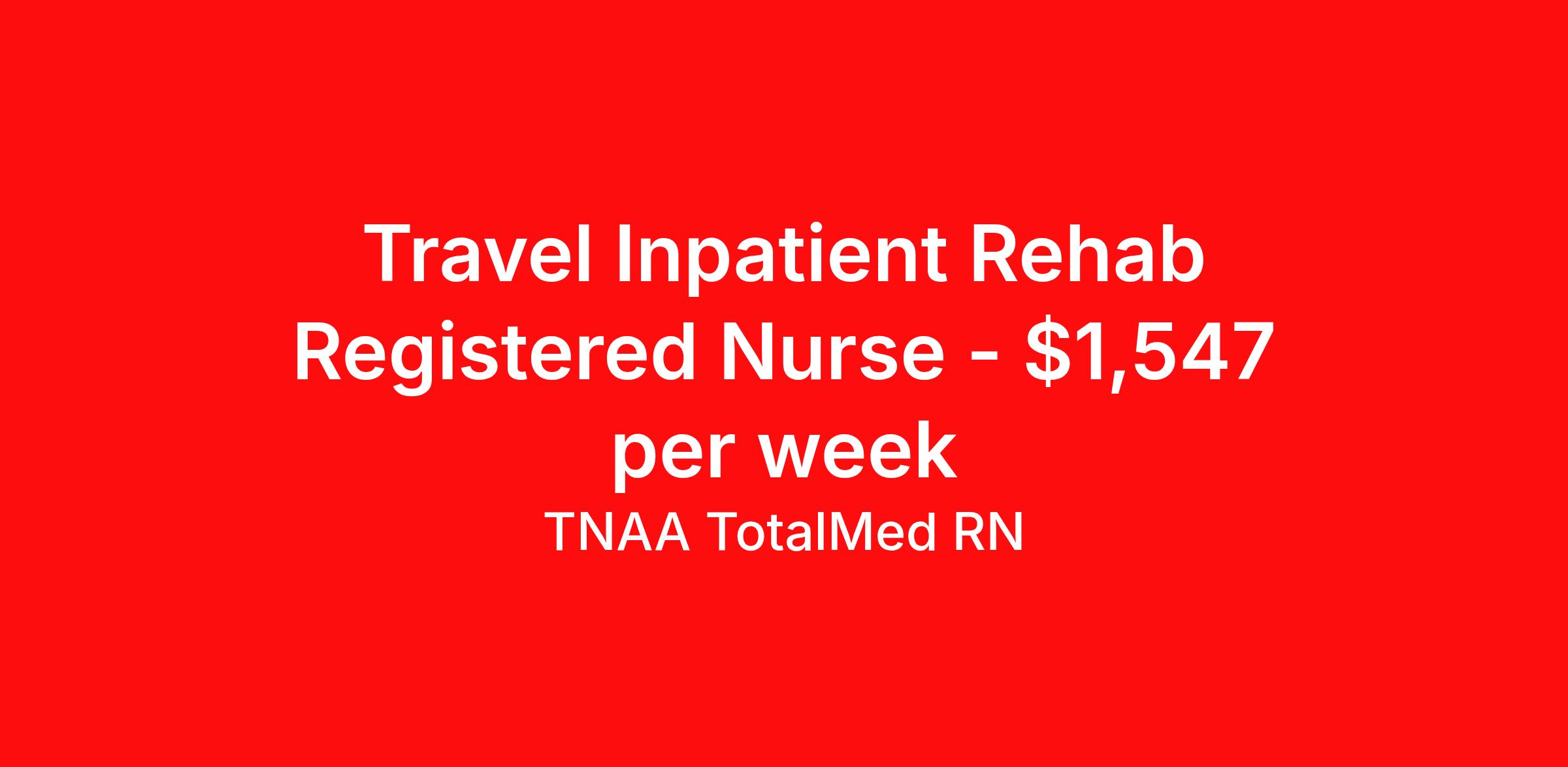 TNAA TotalMed RN is seeking a travel nurse RN Rehabilitation for a travel nursing job in Springdale, Arkansas. Job Description & Requirements Specialty: Rehabilitation Discipline: RN Start Date: 04/13/2026 Duration: 13 weeks 36 hours per week Shift: 12 hours, nights Employment Type: Travel We're looking for Registered Nurses (RN) for an immediate travel opening in Springdale, AR at our Rehabilitation Hospital. The right RN should have at least 1 year of experience in rehabilitation setting. Read below for more details. As an RN in a Rehabilitation Hospital, you will provide specialized care to patients recovering from serious illnesses, injuries, or surgeries. You'll work closely with a multidisciplinary team to create and implement individualized care plans, ensuring that patients regain as much function and independence as possible. As an RN in a Rehabilitation Hospital, you should be prepared to perform the following tasks: Patient Care: Provide direct care to patients with neurological, orthopedic, or other rehabilitation needs, including stroke recovery, spinal cord injuries, joint replacements, or brain injuries Care Planning: Collaborate with physicians, physical therapists, occupational therapists, and other members of the rehab team to develop and implement personalized care plans that support patient recovery goals Monitoring & Assessment: Regularly assess patients' physical and mental condition, monitor vital signs, neurological function, and progress in therapy. Adjust care plans as necessary based on patient response. Medication Administration: Administer medications as prescribed, monitor for side effects, and ensure proper dosage and timely delivery. Assist with pain management strategies to promote patient comfort during rehabilitation Patient Education: Educate patients and families about recovery goals, rehabilitation techniques, safety precautions, and strategies to promote independence in daily activities Emergency Response: Respond to medical emergencies, including sudden changes in condition, respiratory distress, or cardiac issues, and act quickly to stabilize patients when needed. Documentation: Maintain accurate and up-to-date patient records, documenting assessments, treatments, and progress toward rehabilitation goals in the electronic health record (EHR) Discharge Planning: Assist with discharge planning, ensuring patients and families are prepared for post discharge care, including home modifications, continued therapies, and follow-up appointments Collaboration: Work closely with interdisciplinary teams, including physicians, physical therapists, occupational therapists, case managers, and social workers, to provide comprehensive care tailored to each patient's needs The ideal candidate must have at least one year of experience as an RN in a rehabilitation setting. Current BLS certification is required. Additional certifications may be required. Must be eligible for state licensure. Rehabilitation Nurses should be able to stand or walk for long periods and must be able to bend, stoop, and lift with proper body mechanics. They should have excellent communication and organizational skills, as well as the ability to manage complex care needs. They must be compassionate, patient, and skilled in promoting recovery and independence for patients recovering from serious injuries or illnesses. Requirements*: BLS, 2 Years * Additional certifications may be required before beginning an assignment. TotalMed Travel Job ID 1394149. Pay package is based on 12 hour shifts and 36 hours per week (subject to confirmation) with tax-free stipend amount to be determined. Posted job title: Rehab - Rehab RN - Travel Nurse About TNAA TotalMed RN TotalMed is a Top Ten, travel nursing and healthcare staffing agency with the mission of igniting purpose in healthcare. The organization staffs nurses, therapists, pharmacists, and other clinicians of all specialties in all 50 states. They offer local and travel jobs and match caregivers with the right organization to assist both facilities and patients. As an organization, they focus on putting highly-skilled staff into facilities to ensure adequate staffing for a better patient experience. TotalMed specializes in recruiting and placing healthcare professionals in travel, PRN, and permanent positions across the country in Nursing and Allied Health. Throughout 2020, the organization filled roles at even the most short-staffed facilities during the most challenging time in healthcare. By matching the right travel healthcare professional with the right organization, TotalMed continues to offer a lifeline to facilities and their patients. Benefits Weekly pay Guaranteed Hours Continuing Education 401k retirement plan Sick pay Wellness and fitness programs Referral bonus Employee assistance programs Medical benefits Dental benefits Vision benefits Benefits start day 1