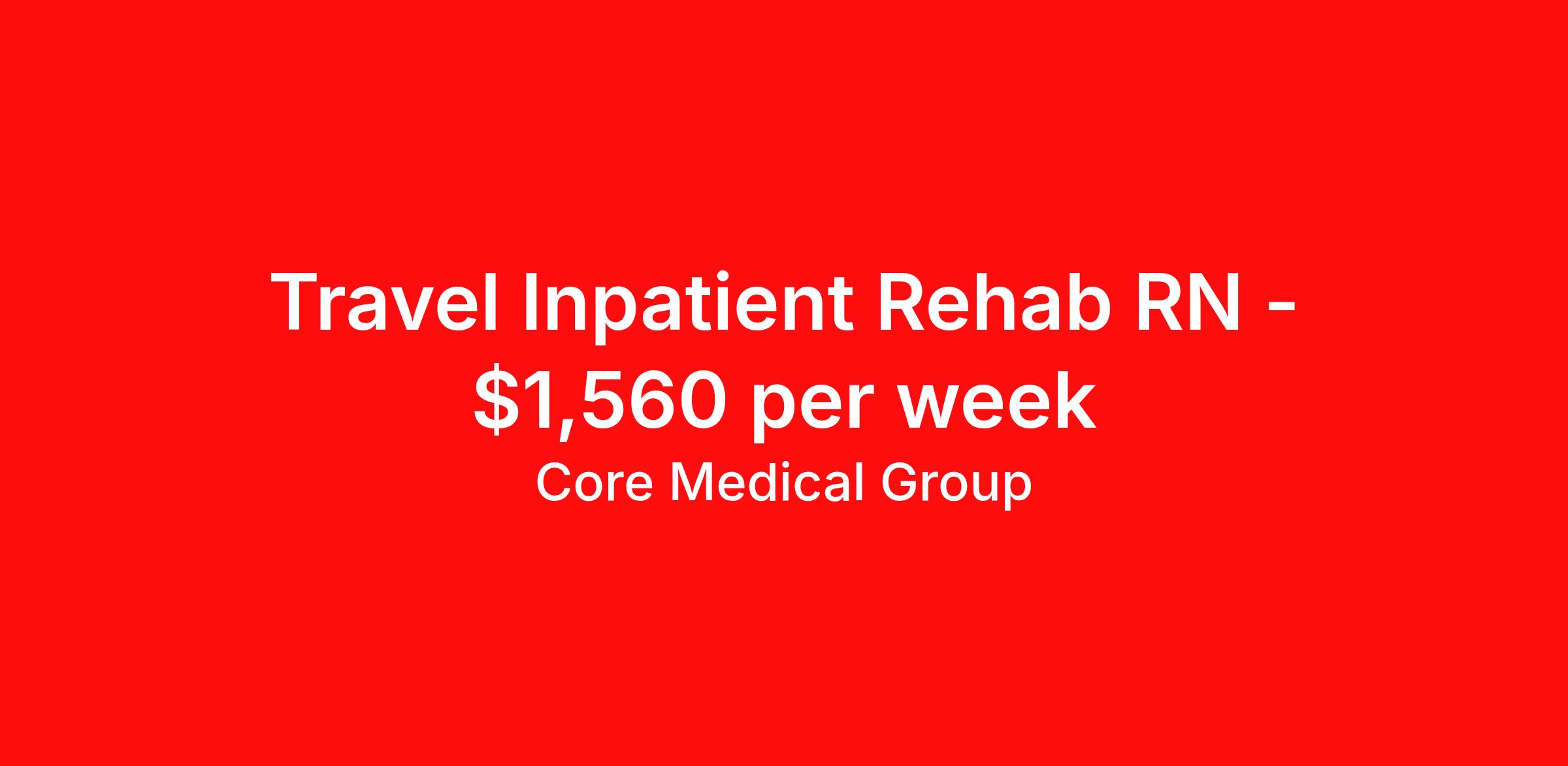 Core Medical Group is seeking a travel nurse RN Rehabilitation for a travel nursing job in Springdale, Arkansas. Job Description & Requirements Specialty: Rehabilitation Discipline: RN Start Date: 04/13/2026 Duration: 13 weeks 36 hours per week Shift: 12 hours Employment Type: Travel Client in AR seeking Registered Nurse: Rehab for the following shift(s): Nights We are looking for a healthcare professional who is ready to provide exceptional patient care in this contract/travel role. Contract/travel assignments are typically 13 weeks, with potential to extend. Help us continue our mission to connect people, improve lives, and give back to the community by joining the CoreMedical Group team. When you work with CoreMedical Group, we put you first and treat you like family, supporting you every step of the way. CoreMedical Group is one of the largest healthcare staffing agencies in the country, with travel and contract positions located across the United States. Our recruiters will help you find the perfect job, whether it's across the country or across the street. In addition to dedicated, personalized support from your recruiter, when you work with CoreMedical Group you'll receive: Access to an extensive benefits package, including day 1 health, dental, and vision insurance, employer paid life insurance, a health reimbursement account, and more! Weekly paychecks with competitive pay packages Matching 401(k) benefits to help you save for retirement Licensure assistance and reimbursement to set you up for success on your contract Travel reimbursement and dedicated housing support while on assignment Referral cash bonuses when you connect us with other clinicians CoreMedical Group also offers you a free, all-inclusive vacation each year as our way of saying "thank you" for your hard work. Join other healthcare professionals on the annual Club CoreMed retreat and you'll see why our contract and travel professionals come back to us year after year! Your career is too valuable to tackle on your own. Let CoreMedical Group help you with your healthcare journey! *Estimate of weekly payments is intended for informational purposes and includes hourly wages, as well as reimbursements for meal & incidental expenses, and housing expenses incurred on behalf of the Company. Any benefits (medical/dental/vision) are in addition to the weekly pay. Please speak with your Recruiter for additional details. Estimated payments are subject to change until formal offer of assignment is made and accepted. Core Medical Group Job ID 1366513. Pay package is based on 12 hour shifts and 36 hours per week (subject to confirmation) with tax-free stipend amount to be determined. Posted job title: RN About Core Medical Group CoreMedical Group is one of the largest healthcare staffing agencies in the country. We have jobs nationwide in travel nursing, travel allied health, interim, locum tenens, and permanent placements! Join the staffing agency with Club CoreMed, the best perk in the industry - an all inclusive paid trip to a tropical resort! Benefits Weekly pay Holiday Pay Guaranteed Hours Continuing Education 401k retirement plan Pet insurance Company provided housing options Sick pay Wellness and fitness programs Mileage reimbursement Referral bonus Employee assistance programs Medical benefits Dental benefits Vision benefits Benefits start day 1 License and certification reimbursement Life insurance Discount program