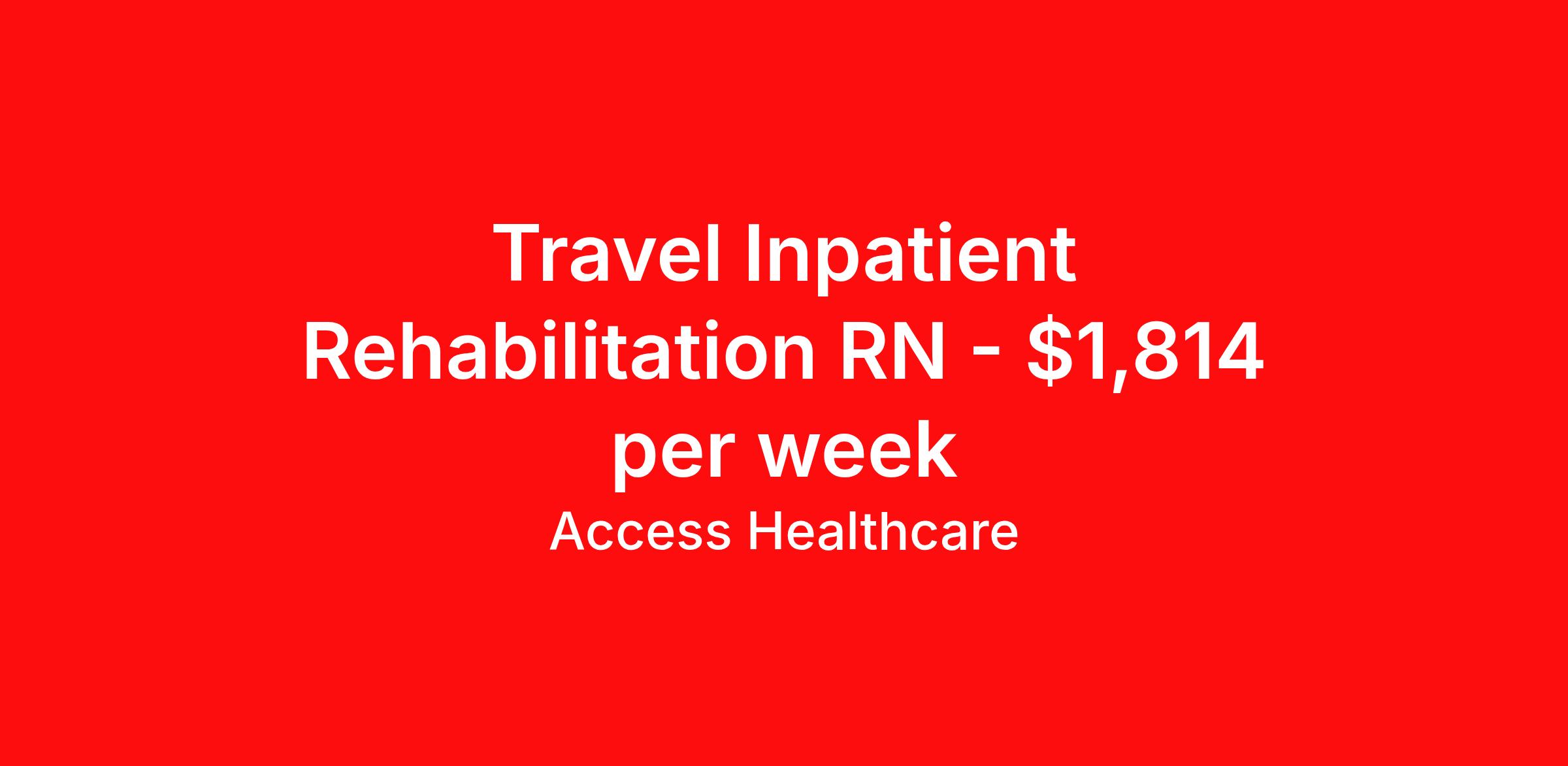 Access Healthcare is seeking a travel nurse RN Rehabilitation for a travel nursing job in Springdale, Arkansas. Job Description & Requirements Specialty: Rehabilitation Discipline: RN Start Date: 04/13/2026 Duration: 13 weeks 36 hours per week Shift: 12 hours, days Employment Type: Travel Access Healthcare Job ID 76380851. Pay package is based on 12 hour shifts and 36 hours per week (subject to confirmation) with tax-free stipend amount to be determined. About Access Healthcare Access Healthcare aims to provide superior service to our nursing family by providing around the clock support, competitive pay packages and an unmatched benefits package! Unlike other agencies, we offer a true family feel and work with you to find the placement that is right for you. We offer one of the top leading pay packages in the industry and we are ready to get you the money you deserve! Access Healthcare was founded by two travel nurses, Danielle and Diego, who had a dream and a shared vision of creating an agency which all nurses would want to work with. Our passion has led us to where we are today as one of the top 10 agencies in our home state of New Jersey, with access to contracts in all 50 states! We encourage you to join our team and we cannot wait to get to know you!