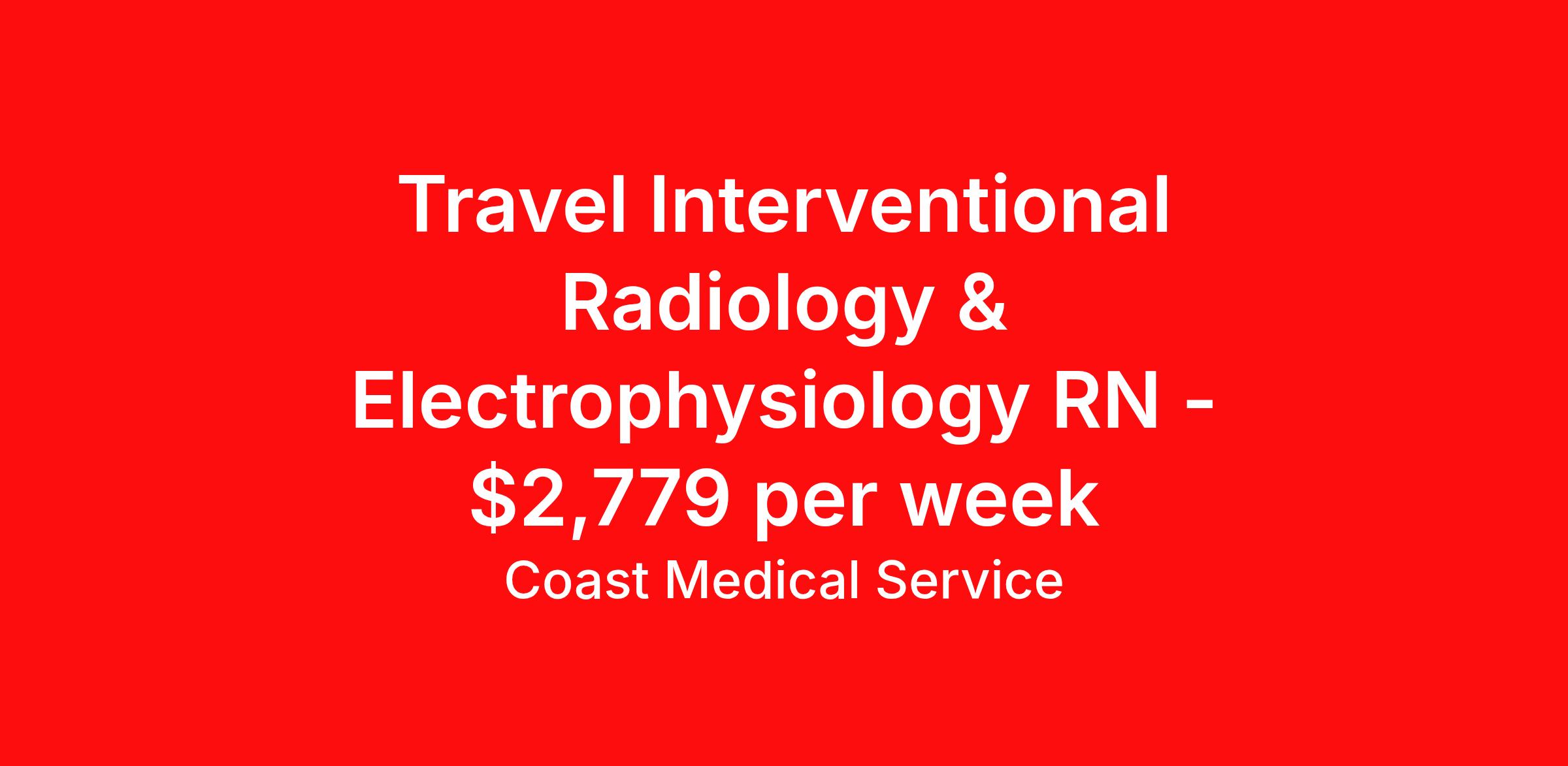 Coast Medical Service is seeking a travel nurse RN Interventional Radiology for a travel nursing job in Salem, Massachusetts. Job Description & Requirements Specialty: Interventional Radiology Discipline: RN Start Date: 04/26/2026 Duration: 13 weeks 36 hours per week Shift: 12 hours, days Employment Type: Travel Coast Medical Service is a nationwide travel nursing & allied healthcare staffing agency dedicated to providing an elite traveler experience for the experienced or first-time traveler. Coast is featured on Blue Pipes' 2023 Best Travel Agencies and named a 2022 Top Rated Healthcare Staffing Firm & 2023 First Half Top Rated Healthcare Staffing Firm by Great Recruiters. Please note that pay rate may differ for locally based candidates. Please apply here or contact a recruiter directly to learn more about this position & the facility, and/or explore others that may be of interest to you. We look forward to speaking with you! Coast Medical Services Job ID 35432468. Pay package is based on 12 hour shifts and 36.0 hours per week (subject to confirmation) with tax-free stipend amount to be determined. Posted job title: RN:Interventional Radiology,07:00:00-19:30:00