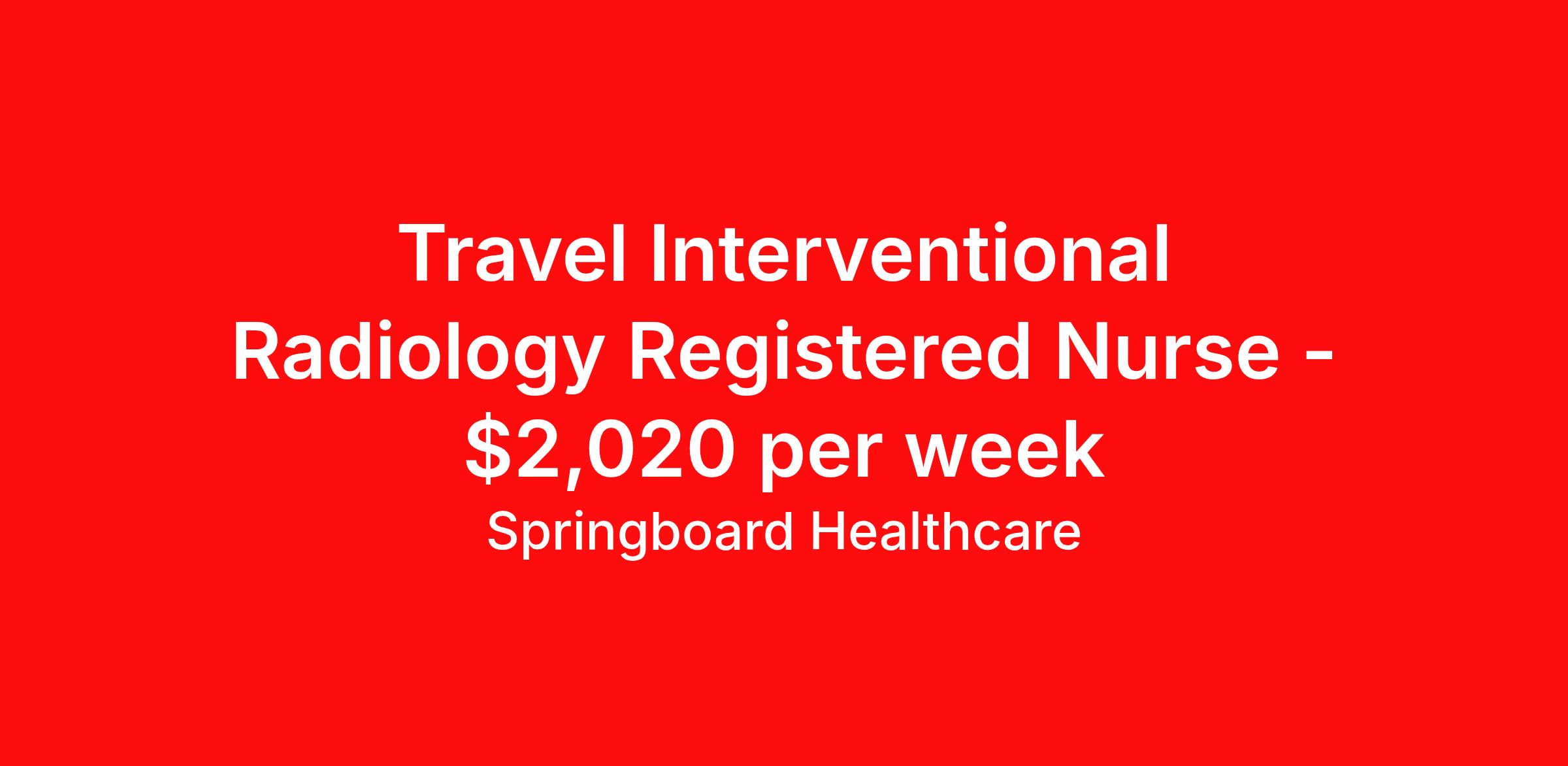 Springboard Healthcare is seeking a travel nurse RN Interventional Radiology for a travel nursing job in Vero Beach, Florida. Job Description & Requirements Specialty: Interventional Radiology Discipline: RN Start Date: 04/21/2026 Duration: 13 weeks 40 hours per week Shift: 10 hours Employment Type: Travel Springboard Healthcare Job ID 838031. Pay package is based on 10 hour shifts and 40 hours per week (subject to confirmation) with tax-free stipend amount to be determined. Posted job title: IR RN