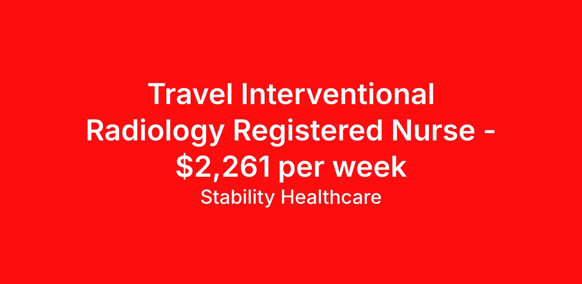 Stability Healthcare is seeking a travel nurse RN Interventional Radiology for a travel nursing job in Charleston, West Virginia. Job Description & Requirements Specialty: Interventional Radiology Discipline: RN Start Date: 04/16/2026 Duration: 13 weeks 40 hours per week Shift: 10 hours, days Employment Type: Travel Stability Healthcare is looking for a Interventional Radiology RN contract position in Charleston, WV. The main goal of radiology nurses is patient safety. They monitor and assess patients, provide education to the patient and family members, ensure the patient and family members understand the procedure and plan of care, Insert and remove intravenous lines, administer conscious sedation drugs and other drugs, monitor patient patterns and vital signs during the procedure, and oversee the safety and comfort of patients before, during, and after procedures. *$600 travel bonus *Day 1 health insurance with United Healthcare *PTO plan start accruing on day 1, use during contract or cash out at the end! *Guaranteed stipend if facility calls you off *Extra hour bonus earn an additional hourly bonus for working over your weekly contracted hours Stability Job ID 826306. Pay package is based on 10 hour shifts and 40 hours per week (subject to confirmation) with tax-free stipend amount to be determined. Posted job title: Interventional Radiology About Stability Healthcare Stability Healthcare was founded in 2009, with the mission of becoming the best Travel Nursing Agency in California. We have been rated one of the top travel nursing agencies and offer our nurses the highest paying travel nursing jobs available. We have access to the best travel assignments from 1000’s of facilities. You can start the year off in sunny California, spend the Spring in the Colorado Rockies, enjoy the Summer in the Mid-West, experience the change of seasons in Boston and New York, and hit the beaches of Florida in the winter. Our Nurses work in the best hospitals and health systems in the country. Benefits Guaranteed Hours Benefits start day 1