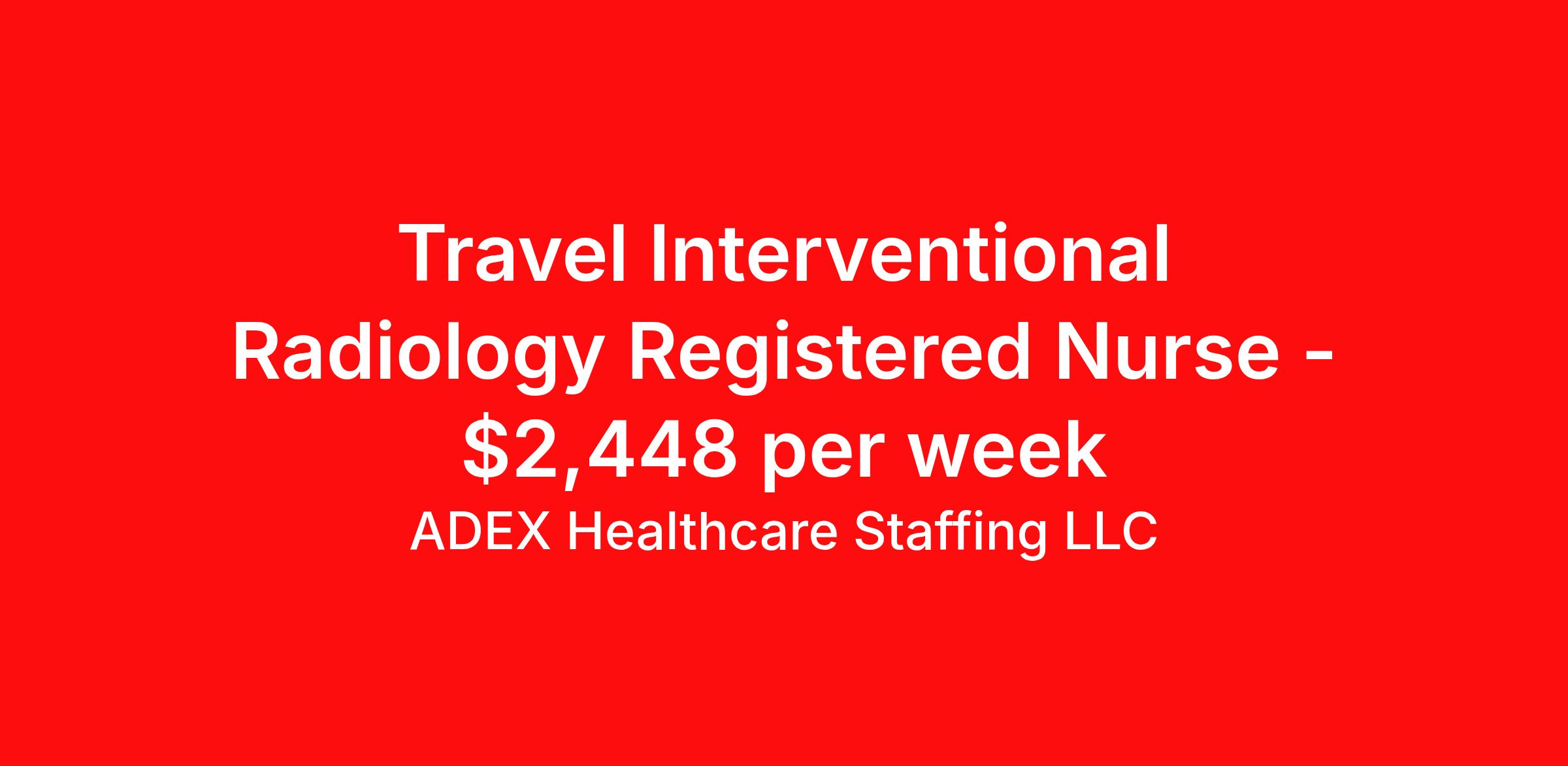 ADEX Healthcare Staffing LLC is seeking a travel nurse RN Interventional Radiology for a travel nursing job in Charleston, West Virginia. Job Description & Requirements Specialty: Interventional Radiology Discipline: RN Start Date: 04/16/2026 Duration: 13 weeks 40 hours per week Shift: 10 hours, days Employment Type: Travel RN Position Job Notes: Travel or Local Registered Nurse needed for ASAP start. A minimum of 2 years of recent hospital bedside experience is required. Candidates must be able to start within 5 weeks. Opportunity for extension upon successful completion of the initial assignment. $750 referral bonus available. Opportunity: RN - IR Job Details: • Work 4x10 hour shifts from 7:30 AM to 6:00 PM on weekdays • On-call every 5th weekend with average of 5 days per month call requirement • 40 guaranteed hours per week • Patient ratio of 1:1 with adult and geriatric population • Minimum 2 years RN experience required with Interventional Radiology experience mandatory • First-time travelers allowed if they have Interventional Radiology experience • Required certifications: BLS and ACLS (American Heart Association) • West Virginia or Compact nursing license required (pending license acceptable) • Perform special procedures including angiogram, fistulogram, permacath, EVAR, TCAR, TAVR, MitraClip, mechanical thrombectomy, and embolization • Treat patients with diagnoses including CKD, CAD, PAD, PVD, stenosis, AAA, stroke, and aneurysm • May be floated to General Lab CDL • Will not accommodate blocked schedules • Must live greater than 100 miles from facility (75-99 miles considered case-by-case) • Scrub color: Royal Blue/White • Chart using Cerner system • Orientation occurs every other Thursday with first 2 days in classroom setting followed by unit orientation • Complete non-billable modules averaging 2-6 hours prior to start date Facility: This healthcare facility is a Level IV Trauma Center and major teaching hospital with 838 total staffed beds. As a member of the Council of Teaching Hospitals and Health Systems, the facility provides comprehensive acute care services with state-of-the-art interventional radiology capabilities. The facility offers extensive interdisciplinary support including IV teams, physical therapy, respiratory services, pharmacy, and rapid response teams, ensuring comprehensive patient care in a collaborative environment. Location: Charleston, WV Charleston offers the perfect blend of urban amenities and natural beauty as West Virginia's capital city, situated along the scenic Kanawha River with easy access to outdoor recreation and cultural attractions. The area provides excellent career opportunities in a close-knit community atmosphere while maintaining the conveniences of a larger metropolitan area. Adex Job ID 3219064. Pay package is based on 10 hour shifts and 40 hours per week (subject to confirmation) with tax-free stipend amount to be determined. About ADEX Healthcare Staffing LLC ADEX has been placing healthcare professionals across the US since 2004. Originally founded in Atlanta, GA, the company's headquarters are now located in Tampa, FL. JCAHO certified since 2009. Benefits Referral bonus