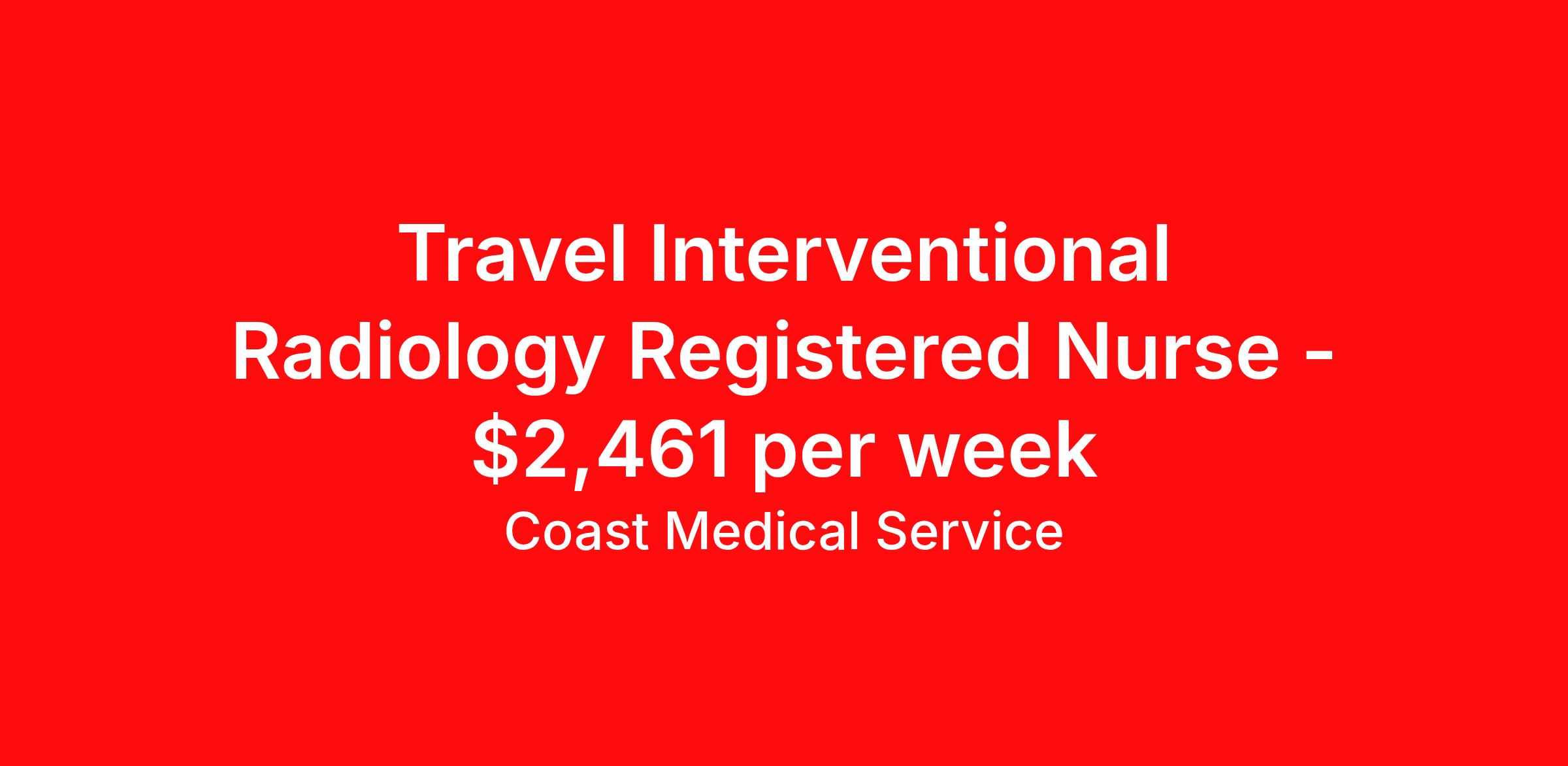 Coast Medical Service is seeking a travel nurse RN Interventional Radiology for a travel nursing job in Everett, Washington. Job Description & Requirements Specialty: Interventional Radiology Discipline: RN Start Date: 04/13/2026 Duration: 13 weeks 40 hours per week Shift: 10 hours, days Employment Type: Travel Coast Medical Service is a nationwide travel nursing & allied healthcare staffing agency dedicated to providing an elite traveler experience for the experienced or first-time traveler. Coast is featured on Blue Pipes' 2023 Best Travel Agencies and named a 2022 Top Rated Healthcare Staffing Firm & 2023 First Half Top Rated Healthcare Staffing Firm by Great Recruiters. Please note that pay rate may differ for locally based candidates. Please apply here or contact a recruiter directly to learn more about this position & the facility, and/or explore others that may be of interest to you. We look forward to speaking with you! Coast Medical Services Job ID 36127157. Pay package is based on 10 hour shifts and 40.0 hours per week (subject to confirmation) with tax-free stipend amount to be determined. Posted job title: RN:Interventional Radiology,07:00:00-17:00:00