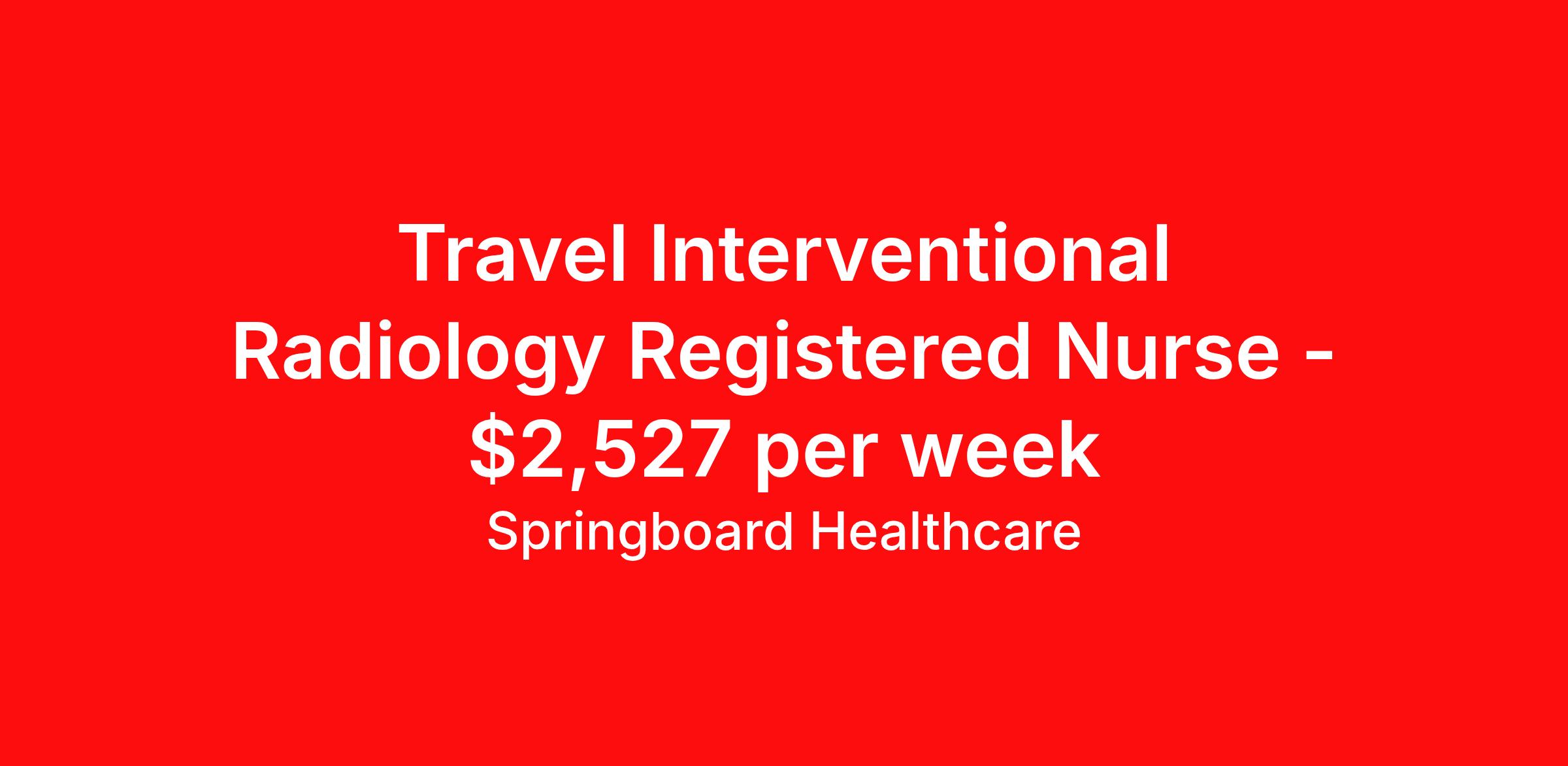 Springboard Healthcare is seeking a travel nurse RN Interventional Radiology for a travel nursing job in Chesterfield, Missouri. Job Description & Requirements Specialty: Interventional Radiology Discipline: RN Start Date: 04/06/2026 Duration: 13 weeks 40 hours per week Shift: 8 hours Employment Type: Travel Springboard Healthcare Job ID 833217. Pay package is based on 8 hour shifts and 40 hours per week (subject to confirmation) with tax-free stipend amount to be determined. Posted job title: IR RN