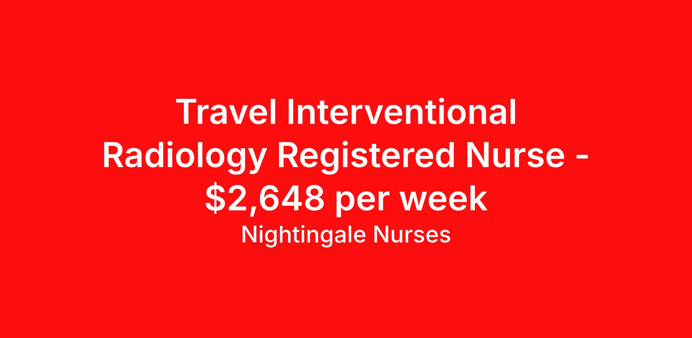 Nightingale Nurses is seeking a travel nurse RN Interventional Radiology for a travel nursing job in Greenville, South Carolina. Job Description & Requirements Specialty: Interventional Radiology Discipline: RN Start Date: 03/28/2026 Duration: 13 weeks 40 hours per week Shift: 10 hours, days Employment Type: Travel About Nightingale Nurses the first name in travel nursing You may not realize it, but as an RN with real world hospital experience, you are legendary. To the lives you’ve helped save, the patients you’ve cared for, and to the hospitals where you’ve done it. And you’re just getting started. Legendary is where Nightingale begins. We’re the first name in travel nursing, representing only the very best RNs. That’s why hospitals prefer us, allowing us to offer exceptional travel nursing assignments all over the US, as well as the highest pay rates and most extensive benefits in the industry. Nightingale facilitates every aspect of your travel nursing assignment, so you can focus on doing what you do best. We want you to grow, explore, and enjoy unrivaled liberty, the freedom to nurse.