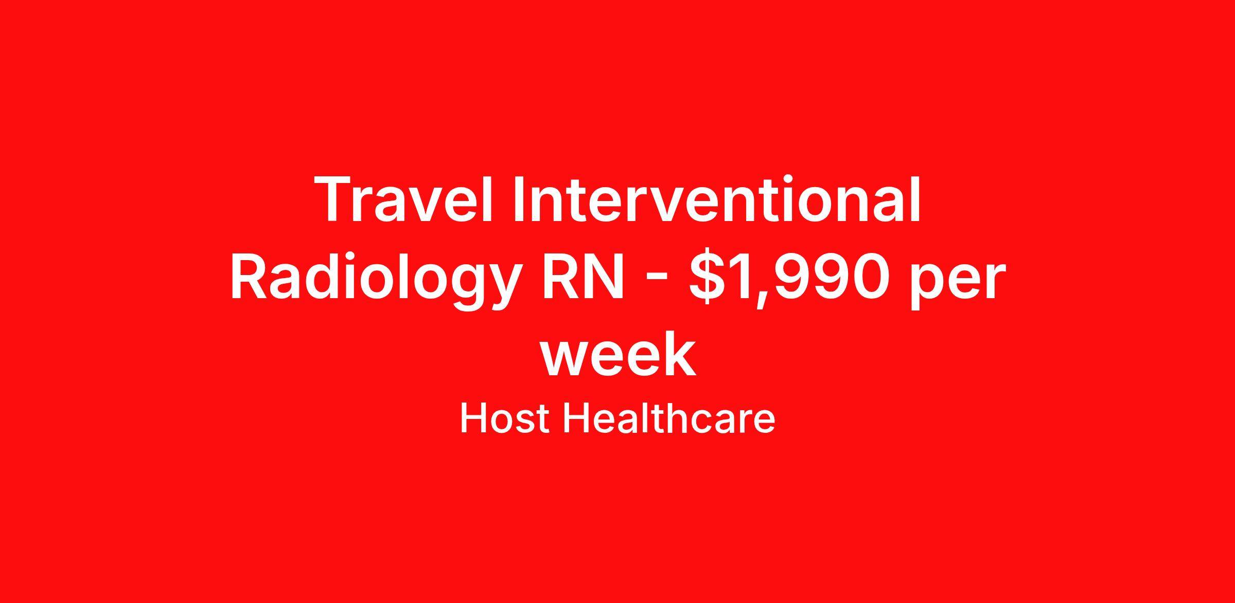 Host Healthcare is seeking a travel nurse RN Interventional Radiology for a travel nursing job in Charleston, West Virginia. Job Description & Requirements Specialty: Interventional Radiology Discipline: RN Start Date: 04/02/2026 Duration: 13 weeks 40 hours per week Shift: 8 hours, days Employment Type: Travel Host Healthcare Job ID a1fVX000002sv6bYAA. Pay package is based on 8 hour shifts and 40 hours per week (subject to confirmation) with tax-free stipend amount to be determined. Posted job title: RN - Interventional Radiology About Host Healthcare At Host Healthcare, we provide a truly comfortable experience as you explore your travel nursing, therapy, or allied career. We make your travel healthcare journey easy by taking care of all the details, so you don’t have to. We are on a mission to help others live better and we do this by helping the healers of the world be as comfortable as possible. With access to tens of thousands of travel nursing, therapy, and allied jobs in all 50 states, our responsive and friendly recruiters find your dream position based on what’s important to you. During your assignment, get access to premium benefits, including Day 1 medical that continues up to 30 days between assignments, 401K matching, travel reimbursements, dedicated housing support, and more. We also offer 24/7 support from our team and access to our on-staff clinicians so you can feel comfortable and confident throughout your entire assignment. Travel comfortably with Host Healthcare. Benefits Referral bonus School loan reimbursement Vision benefits Wellness and fitness programs Company provided housing options License and certification reimbursement Life insurance Medical benefits Mileage reimbursement Pet insurance Discount program Employee assistance programs Guaranteed Hours Health savings account Holiday Pay 401k retirement plan Continuing Education Dental benefits