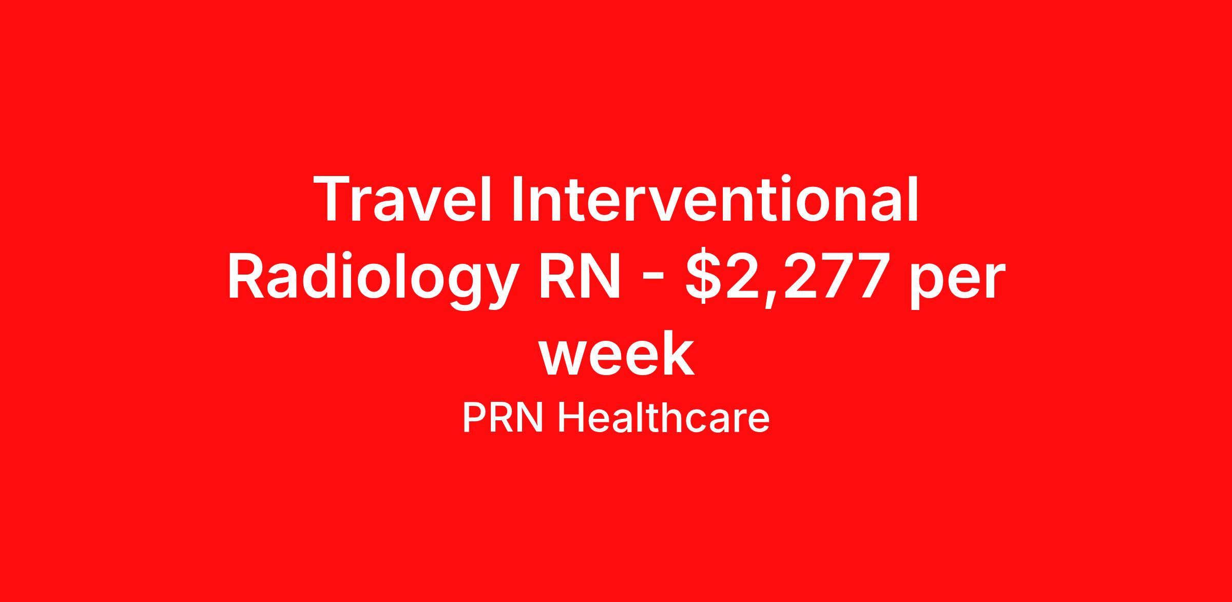PRN Healthcare is seeking a travel nurse RN Interventional Radiology for a travel nursing job in Charleston, West Virginia. Job Description & Requirements Specialty: Interventional Radiology Discipline: RN Start Date: 04/16/2026 Duration: 13 weeks 40 hours per week Shift: 8 hours, days Employment Type: Travel PRN Healthcare Job ID 1514864. Pay package is based on 8 hour shifts and 40 hours per week (subject to confirmation) with tax-free stipend amount to be determined. Posted job title: Interventional Radiology RN About PRN Healthcare Our story starts with a 21-year-old CNA named Pete Hietpas. Pete was diligently working in eastern Wisconsin with a variety of staffing agencies, but something was missing. He loved caring for his patients, but felt that staffing agencies were exchanging compassion for competitiveness. He was determined to change that. As a result, he started Nurses PRN in 1995 to become a model for the healthcare staffing industry – being competitive in the marketplace, yet still maintaining a compassionate heart. Over the years Nurses PRN grew and evolved as a nationwide healthcare staffing company, and therefore wanted to be more inclusive to all valued healthcare professionals: nurses, allied health, locum tenens, CNAs, and more. This lead to the introduction of PRN Healthcare, which is inclusive of Nurses PRN and all of our other healthcare divisions. Our mission to create authentic, meaningful relationships with our healthcare professionals helps us set them up for success in their dream assignment, whether that be a travel contract, local contract, or per diem shift. This is all driven by the simple idea that better care for our healthcare workers, leads to better patient care – and this is all supported by a dedicated internal staff. Our company culture is strongly backed by faith-based values and activities, to remind us that our success provides us the opportunity to serve and give back to our communities. This is the spirit of caregiving. This is PRN Healthcare. Benefits Weekly pay Guaranteed Hours Continuing Education 401k retirement plan Referral bonus Employee assistance programs Company provided housing options Medical benefits Dental benefits Vision benefits Life insurance