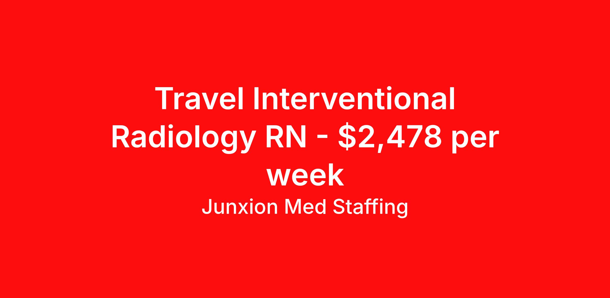 Junxion Med Staffing is seeking a travel nurse RN Interventional Radiology for a travel nursing job in Houston, Texas. Job Description & Requirements Specialty: Interventional Radiology Discipline: RN Start Date: 04/13/2026 Duration: 8 weeks 40 hours per week Shift: 10 hours, rotating Employment Type: Travel Summary: Junxion Med Staffing is looking for a Interventional Radiology RN to take an assignment in Houston, Texas. This assignment lasts 8.14 WEEKS and is scheduled to start on April 13, 2026. If you don't like the start date, pay, or shift, then let’s talk. Give us a call opt 1 Job Details: Shift: 10H Rotating Total Weekly Hours: 40 Certifications: BLS, ACLS, BLS (AHA), NIHSS Trauma Level: Benefits: Day 1 Insurance Additional bonus potential for every contract Additional vacation incentives Medical insurance with no more than $175 monthly premium for employee Employee Assistance Program (EAP) Referral bonus up to $1,000 401K and access to financial advisors for financial wellness and education A dedicated recruiter and support team that will help you every step of the way to sure you start on time and have an exceptional experience An agency ran by a traveler for travelers Click here for licensing requirements About the Company: Junxion Med Staffing is an award-winning healthcare staffing company with a mission to provide quality healthcare to our communities. Apply today to speak with a recruiter! Awards: RNVIP- Top 10 Travel Nursing Agencies of 2024 BluePipes – The Best Travel Nursing Companies 2023 *Estimated weekly pay includes projected hourly wages and weekly meal and lodging per diems for eligible clinicians based on nationally published GSA rates. Actual weekly pay and per diems may differ from the amount shown and may be subject to change during an assignment. For all employees and employee applicants, Junxion Med Staffing is an Equal Employment Opportunity ("EEO") Employer, including Disability/Vets, and welcomes all to apply. Junxion Med Staffing Job ID 1363520. Pay package is based on 10 hour shifts and 40 hours per week (subject to confirmation) with tax-free stipend amount to be determined. About Junxion Med Staffing Junxion Med Staffing was founded by a former healthcare traveler who understands the challenges healthcare professionals face - because we’ve been there. We specialize in placing travel nurses, allied health professionals, physicians, physician assistants, and nurse practitioners in both short-term and permanent roles across a wide range of specialties. Whether you're looking for a travel contract or a long-term fit, we work to ensure the right match between each healthcare professional and facility. At Junxion, we keep it simple: ● Transparent communication. No surprises, no hidden details, just honest conversations so you always know what to expect. ● Dedicated support. From job search to contract negotiations and throughout your assignment, you’ll have a recruiter who’s with you every step of the way. ● Competitive pay and benefits. We advocate for you to be fairly compensated and supported in your goals. ● A focus on your success. When healthcare professionals feel valued and empowered, patient care improves and that’s what it’s all about. You’re not just a number here. You’re part of a team that actually cares. Let’s find your next great opportunity together. Benefits Weekly pay Referral bonus Dental benefits Vision benefits 401k retirement plan Medical benefits Mileage reimbursement