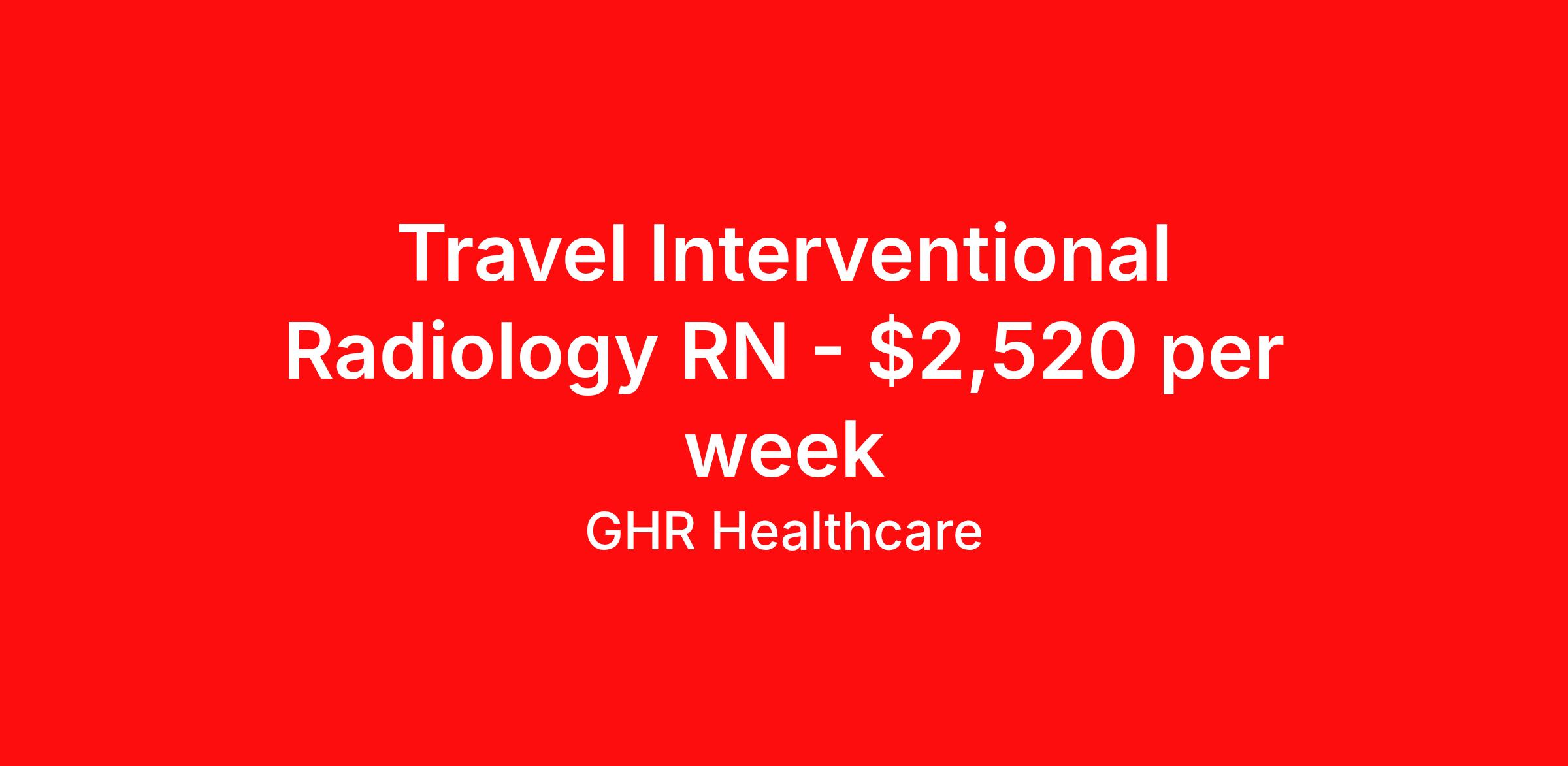 GHR Healthcare is seeking a travel nurse RN Interventional Radiology for a travel nursing job in Cleveland, Ohio. Job Description & Requirements Specialty: Interventional Radiology Discipline: RN Start Date: 04/20/2026 Duration: 13 weeks 36 hours per week Shift: 12 hours Employment Type: Travel GHR Healthcare Job ID 76097661. Pay package is based on 12 hour shifts and 36 hours per week (subject to confirmation) with tax-free stipend amount to be determined. About GHR Healthcare For over 30 years, GHR Healthcare has been the bridge between healthcare professionals and the facilities that need them nationwide. We're committed to uncovering your ideal fit, supported by GHR's dedication to competitive compensation, transparent communication, and a devoted team that genuinely cares about your career journey. You can trust us to stand by your side as your advocate, confidante, and partner in advancing your career. At GHR, care and consideration are at the heart of everything we do. Visit ghrhealthcare.com to learn more.