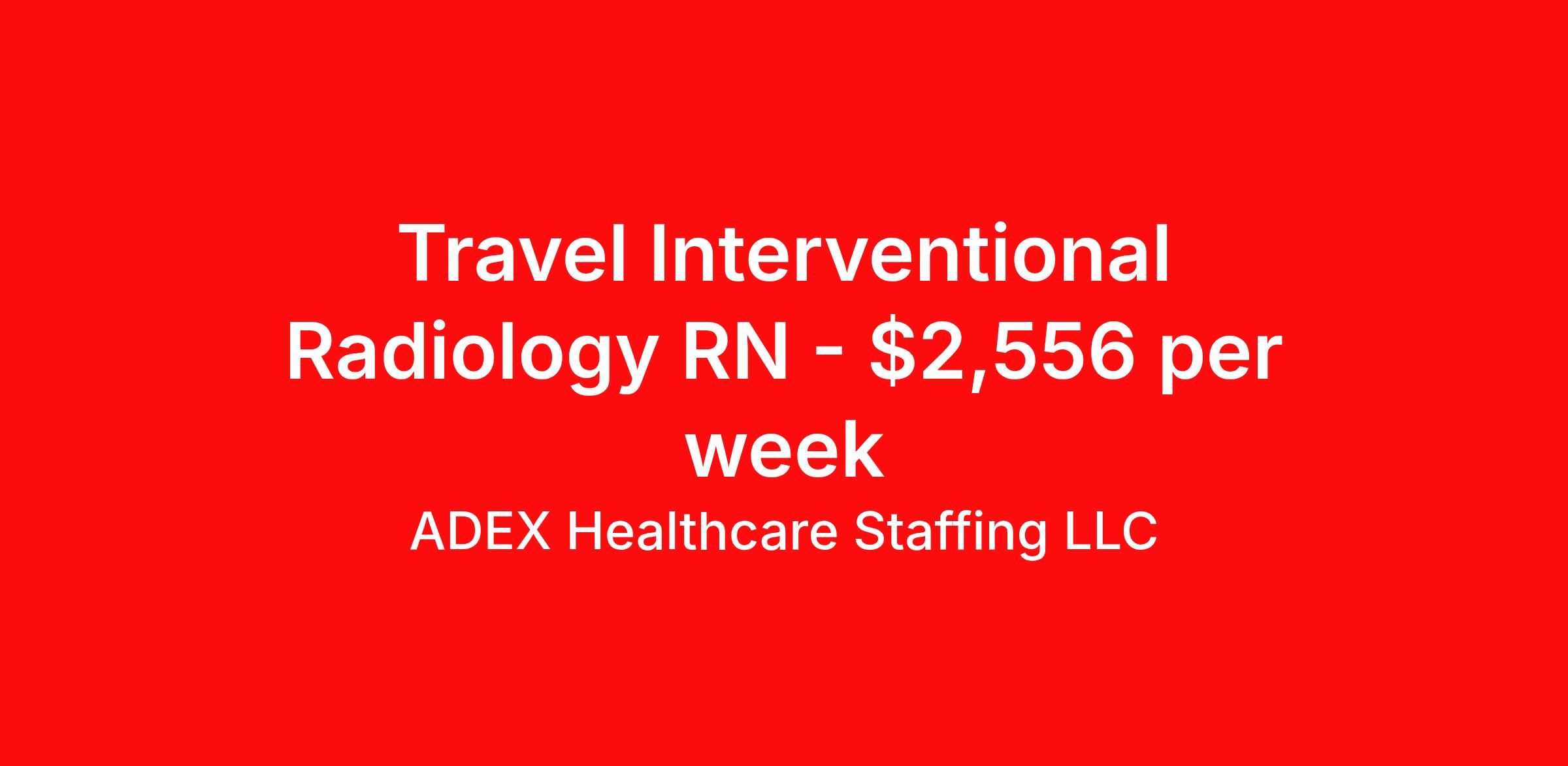 ADEX Healthcare Staffing LLC is seeking a travel nurse RN Interventional Radiology for a travel nursing job in Houston, Texas. Job Description & Requirements Specialty: Interventional Radiology Discipline: RN Start Date: 04/13/2026 Duration: 8 weeks 40 hours per week Shift: 10 hours, rotating Employment Type: Travel RN Position Job Notes: Travel or Local Registered Nurse needed for ASAP start. A minimum of 2 years of recent hospital bedside experience is required. Candidates must be able to start within 5 weeks. Opportunity for extension upon successful completion of the initial assignment. $750 referral bonus available. Opportunity: RN - IR Job Details: • Work variable 4x10 hour shifts with options of 7:00 AM - 5:30 PM or 8:00 AM - 6:00 PM • Participate in 7-day call coverage per rotation with call required one day per month, sometimes two • Radiology nursing experience in interventional radiology/procedural preferred • If no radiology nursing experience, ICU or Emergency Room experience required • Critical care experience (ICU) strongly preferred • Experience with CT scans, interventional medicine, moderate sedation, PICC lines, and anesthesia care • Work environment similar to a Cath Lab setting • Handle scheduled outpatients and emergency patients as needed • Must be flexible as workload can vary and become very busy • Required certifications: ACLS, BLS (AHA), NIHSS • Use EPIC charting system • BSN not required • Manager offers flexible scheduling • Acute care setting Facility: This major healthcare organization operates a comprehensive medical center providing advanced interventional radiology services. The facility features state-of-the-art imaging and procedural equipment, offering a wide range of interventional procedures in a setting similar to a cardiac catheterization lab. The organization maintains high standards for patient care and utilizes modern technology to support complex medical procedures and imaging services. Location: Houston, TX Houston offers an exciting metropolitan experience as the fourth-largest city in the United States, known for its diverse culture, world-class dining scene, and thriving job market. The city provides excellent professional opportunities in healthcare while offering vibrant entertainment, arts districts, and year-round outdoor activities in a dynamic urban environment. Adex Job ID 1070209. Pay package is based on 10 hour shifts and 40 hours per week (subject to confirmation) with tax-free stipend amount to be determined. About ADEX Healthcare Staffing LLC ADEX has been placing healthcare professionals across the US since 2004. Originally founded in Atlanta, GA, the company's headquarters are now located in Tampa, FL. JCAHO certified since 2009. Benefits Referral bonus