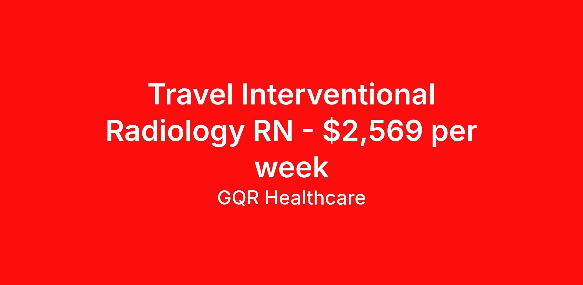 GQR Healthcare is seeking a travel nurse RN Interventional Radiology for a travel nursing job in Columbia, Missouri. Job Description & Requirements Specialty: Interventional Radiology Discipline: RN Start Date: 03/30/2026 Duration: 13 weeks 36 hours per week Shift: 12 hours, days Employment Type: Travel Contract - W2 Interventional | Radiology Registered Nurse (RN) Job Location: Columbia, Missouri Start Date: March 30, 2026 Profession: Registered Nurse (RN) Facility: Estimated Pay: $2568.64 - $2663.64 Duration:13 weeks Specialty:Interventional | Radiology Shift: Day Shift Details: null Day Job Type: Travel *Estimated weekly pay includes projected hourly wages and weekly meal and lodging per diems for eligible clinicians based on nationally published GSA rates. Actual weekly pay and per diems may differ from the amount shown and are subject to change during an assignment. Benefits: Day 1 Insurance Cigna medical, MetLife dental and vision insurance License reimbursement for new licenses needed for each assignment Discounts with hotels and rental cars A dedicated recruiter and support team that will help you every step of the way to sure you start on time and have an exceptional experience Referral bonus up to $700 About the Company: Finding the right role is about more than just matching skills to a job—it’s about aligning with your goals, values, and the way you want to work. As an award-winning talent partner, we support healthcare professionals through every step of that process, offering meaningful opportunities, clear guidance, and long-term partnership. From our first conversation to your first day on the job (and beyond!), we’re here to help you move forward with confidence. GQR Job ID 788360. Pay package is based on 12 hour shifts and 36 hours per week (subject to confirmation) with tax-free stipend amount to be determined. Posted job title: Registered Nurse (RN) About GQR Healthcare GQR’s Healthcare team specializes in connecting experts within the industry to highly skilled healthcare professionals across the US market. In the competitive healthcare market, we recognize that the industry’s common goals of improved quality of care and patient outcomes are wholly reliant upon the professionals directly supporting these initiatives. Leveraging our extensive candidate network, we deliver continuity of care for the communities our partners serve to ensure the patient experience is of the highest quality. Through deep market specialization and a unique approach to talent acquisition, GQR Healthcare provides an unparalleled and personalized experience across all medical specialties in nursing and within diverse healthcare platforms across the industry.
