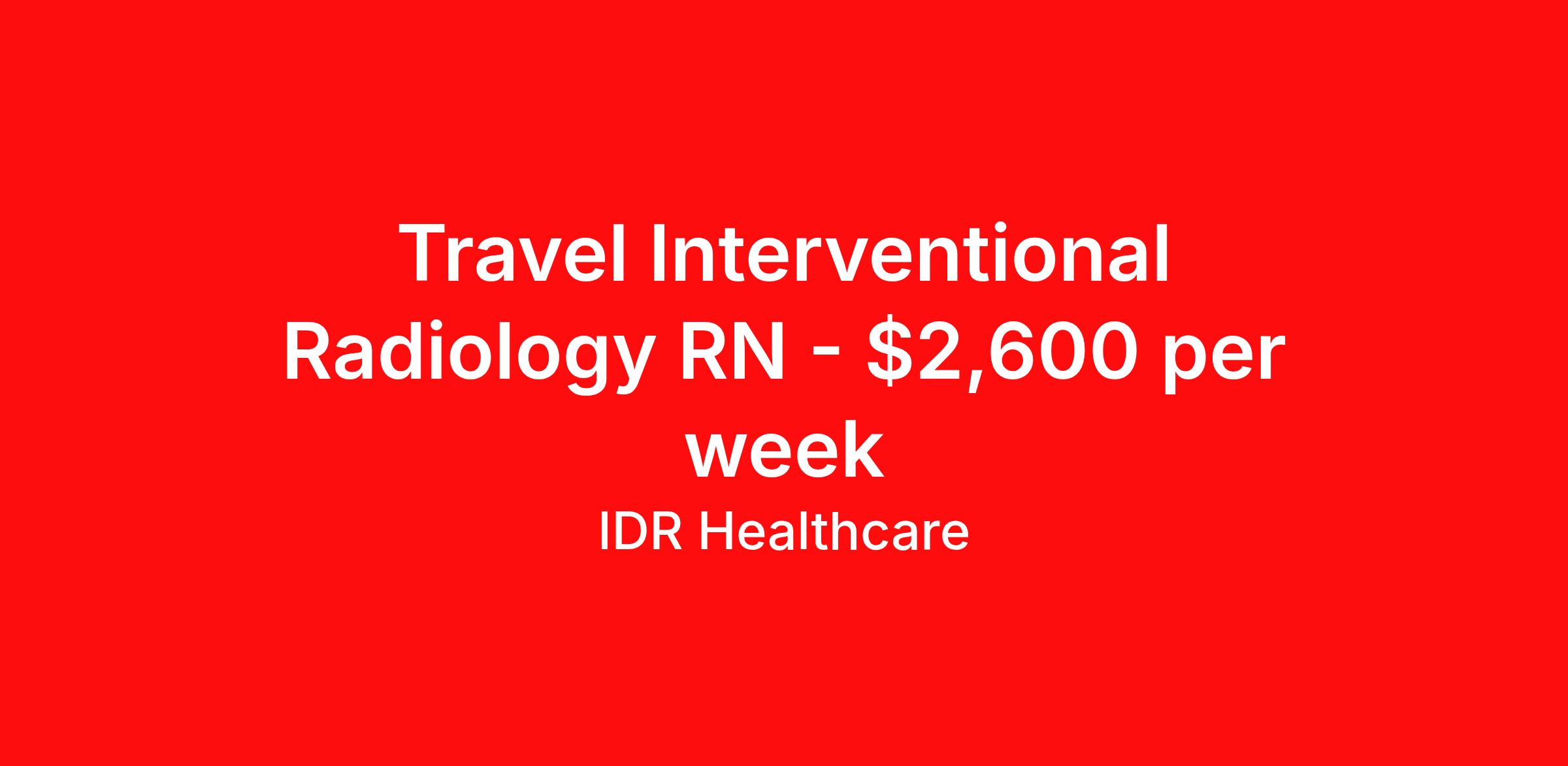 IDR Healthcare is seeking a travel nurse RN Interventional Radiology for a travel nursing job in Houston, Texas. Job Description & Requirements Specialty: Interventional Radiology Discipline: RN Start Date: 04/13/2026 Duration: 13 weeks 40 hours per week Shift: 8 hours, days Employment Type: Travel IDR Healthcare is an awarding winning staffing firm that believes it is a privilege and awesome responsibility to serve those who selflessly care for others. Our mission is to empower healthcare professionals to achieve their fullest potential both personally and professionally while they create positive change within the healthcare community. We exercise true grit, tenacity, and authenticity while embracing and ownership mindset to go above and beyond providing healthcare professionals a world class experience. We are employee owned and our travelers and clinicians earn shares/equity by just completing multiple assignments! We have been named SIA’s Fastest Growing Staffing Firms and have won ClearlyRated® Best of Staffing for 11 consecutive years! This cements our commitment to clinician satisfaction earning top net promoter scores putting us in the top 2% of agencies in North America! TravelFarWithIDR and see what an extraordinary experience is all about! Benefits 2024 World Staffing Best Staffing Firms to Work For! ESOP (Equity) Healthcare Benefits for up to 30 days Between Assignments Comprehensive Health Insurance Dental and Vision Insurance Sign-On, Completion, & Referral Bonus Programs License and Certification Reimbursement Weekly Pay and Competitive Compensation Large Network of Clients and Job Opportunities 401k retirement plan Exclusive Assignments IDR Job ID 497875. Pay package is based on 8 hour shifts and 40 hours per week (subject to confirmation) with tax-free stipend amount to be determined. About IDR Healthcare IDR Healthcare is an awarding winning staffing firm that believes it is a privilege and awesome responsibility to serve those who selflessly care for others. Our mission is to empower healthcare professionals to achieve their fullest potential both personally and professionally while they create positive change within the healthcare community. We exercise true grit, tenacity, and authenticity while embracing and ownership mindset to go above and beyond providing healthcare professionals a world class experience. We are employee owned and our travelers and clinicians earn shares/equity by just completing multiple assignments! We have been named SIA’s Fastest Growing Staffing Firms and have won ClearlyRated® Best of Staffing for 11 consecutive years! This cements our commitment to clinician satisfaction earning top net promoter scores putting us in the top 2% of agencies in North America! Help us give back! For every booked assignment, proceeds are donated to St. Jude and Feeding America! Last year we raised over $18,000 for St. Jude and provided over 49,000 meals for children in need. TravelFarWithIDR and see what it is all about! Benefits Weekly pay 401k retirement plan Referral bonus Medical benefits Dental benefits License and certification reimbursement Vision benefits