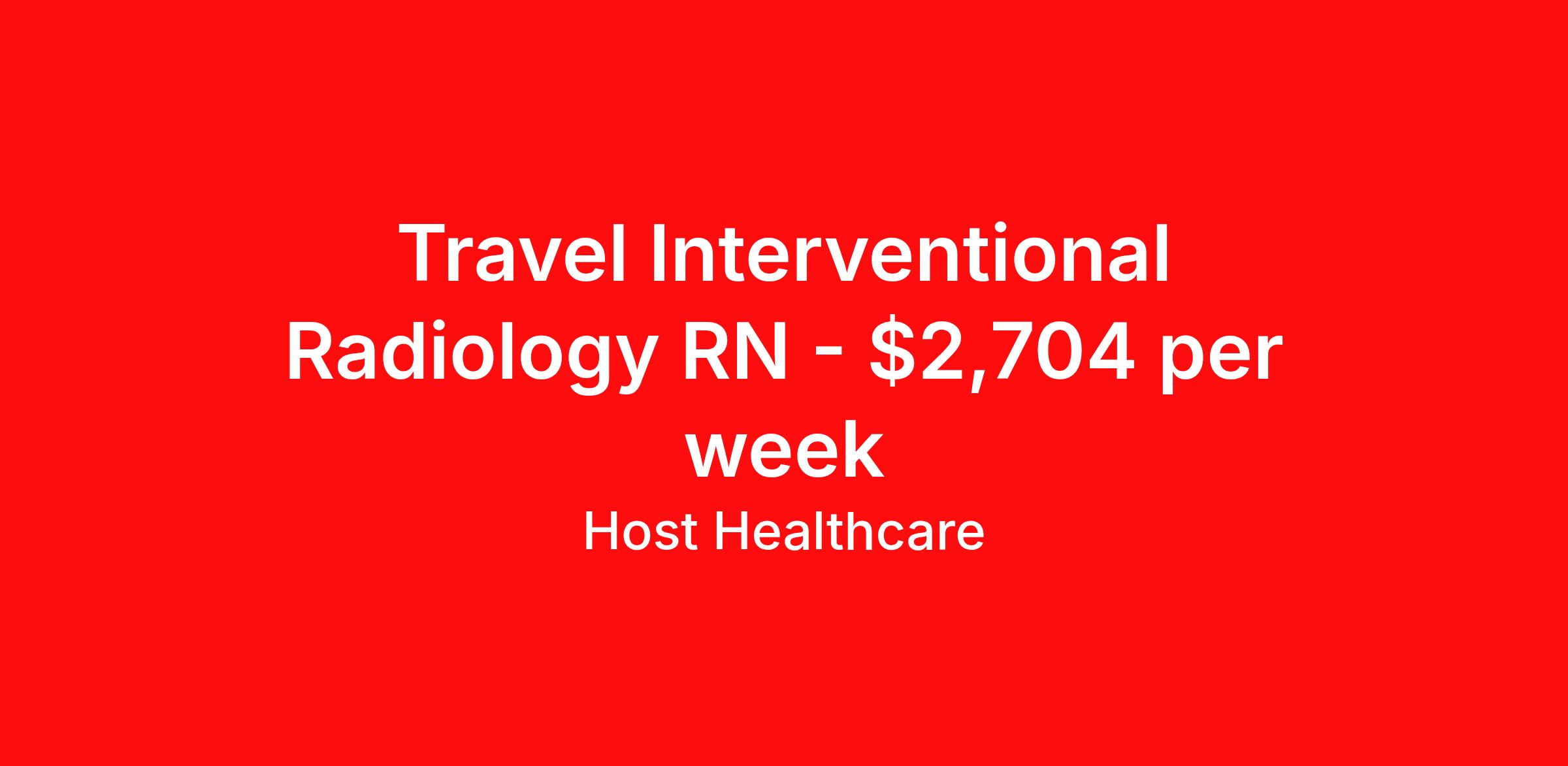 Host Healthcare is seeking a travel nurse RN Interventional Radiology for a travel nursing job in Columbia, South Carolina. Job Description & Requirements Specialty: Interventional Radiology Discipline: RN Start Date: 04/06/2026 Duration: 13 weeks 40 hours per week Shift: 8 hours, days Employment Type: Travel Host Healthcare Job ID a1fVX000002ooEzYAI. Pay package is based on 8 hour shifts and 40 hours per week (subject to confirmation) with tax-free stipend amount to be determined. Posted job title: Interventional Radiologist About Host Healthcare At Host Healthcare, we provide a truly comfortable experience as you explore your travel nursing, therapy, or allied career. We make your travel healthcare journey easy by taking care of all the details, so you don’t have to. We are on a mission to help others live better and we do this by helping the healers of the world be as comfortable as possible. With access to tens of thousands of travel nursing, therapy, and allied jobs in all 50 states, our responsive and friendly recruiters find your dream position based on what’s important to you. During your assignment, get access to premium benefits, including Day 1 medical that continues up to 30 days between assignments, 401K matching, travel reimbursements, dedicated housing support, and more. We also offer 24/7 support from our team and access to our on-staff clinicians so you can feel comfortable and confident throughout your entire assignment. Travel comfortably with Host Healthcare. Benefits Referral bonus School loan reimbursement Vision benefits Wellness and fitness programs Company provided housing options License and certification reimbursement Life insurance Medical benefits Mileage reimbursement Pet insurance Discount program Employee assistance programs Guaranteed Hours Health savings account Holiday Pay 401k retirement plan Continuing Education Dental benefits