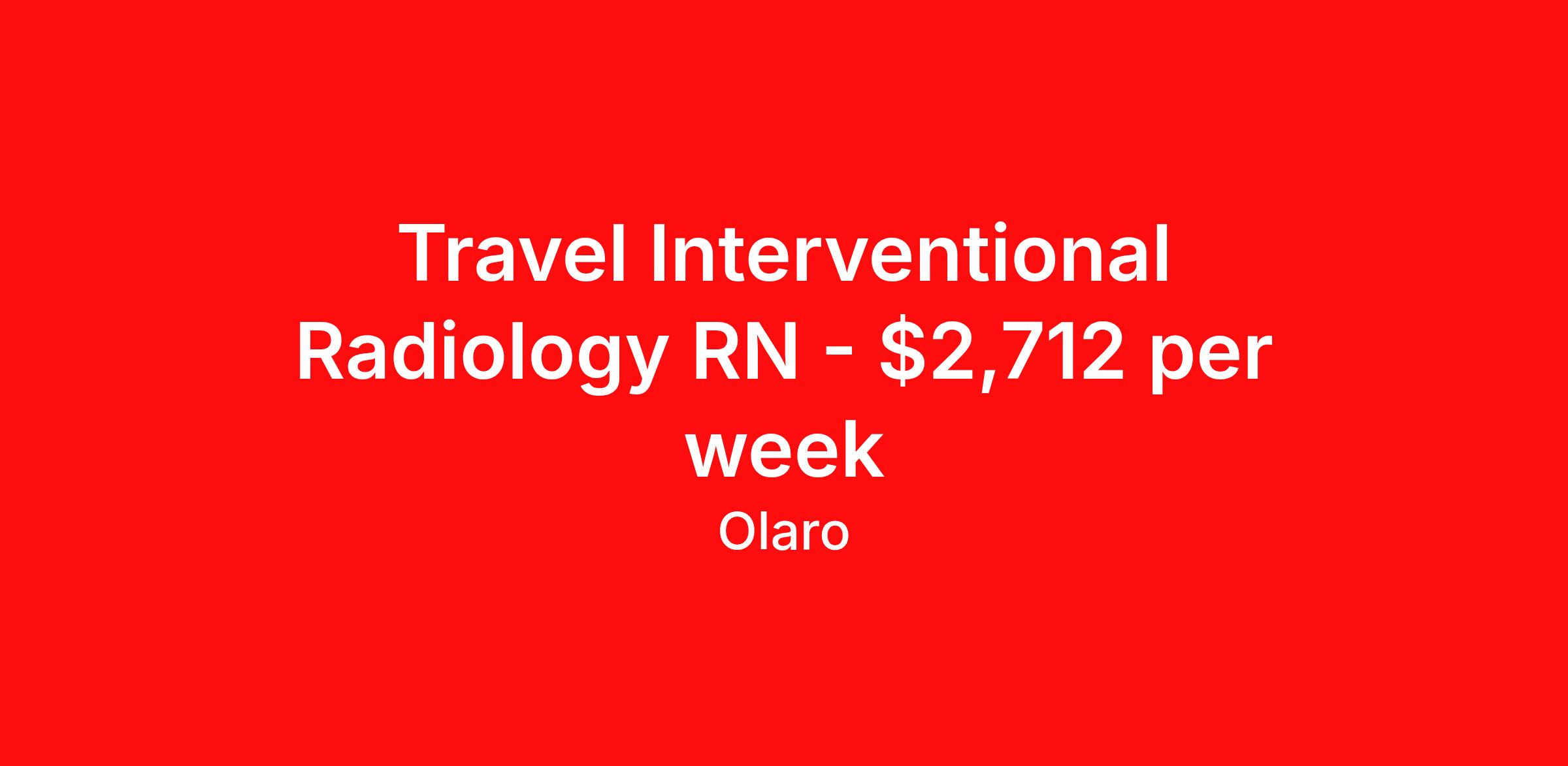 Olaro is seeking a travel nurse RN Interventional Radiology for a travel nursing job in Cleveland, Ohio. Job Description & Requirements Specialty: Interventional Radiology Discipline: RN Start Date: 04/20/2026 Duration: 13 weeks 40 hours per week Shift: 10 hours, days Employment Type: Travel PHP Job ID 473060. Pay package is based on 10 hour shifts and 40 hours per week (subject to confirmation) with tax-free stipend amount to be determined. Posted job title: Interventional Radiology RN About Olaro Olaro Company Description Olaro is a trusted partner in healthcare staffing, connecting nurses and allied health professionals with opportunities nationwide. For over 35 years, we’ve helped clinicians expand their horizons by matching them with assignments that fit their lifestyle, career goals, and personal ambitions. At Olaro, we value your expertise and support your growth at every step. We offer competitive pay, comprehensive benefits, and access to diverse clinical experiences that build your skills and open doors to new possibilities. With 24/7 support, streamlined onboarding, and a team committed to your success, you’ll always have a proven guide by your side. Whether you want to explore new locations, broaden your clinical experience, or achieve better work–life balance, Olaro provides the flexibility and support to help you thrive. Join us, and let’s shape the future of healthcare together.