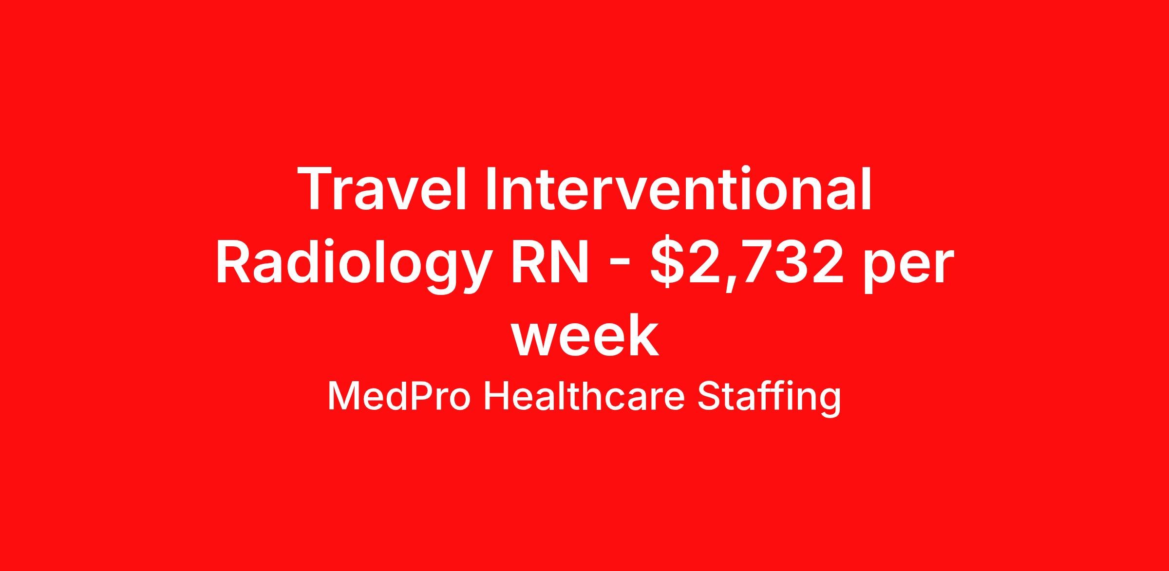 MedPro Healthcare Staffing is seeking a travel nurse RN Interventional Radiology for a travel nursing job in Greenville, South Carolina. Job Description & Requirements Specialty: Interventional Radiology Discipline: RN Start Date: 04/13/2026 Duration: 13 weeks 40 hours per week Shift: 8 hours, days Employment Type: Travel MedPro Healthcare Staffing , a Joint Commission-certified staffing agency, is seeking a quality Interventional Radiology Tech for a contract with one of our top healthcare clients. Requirements Current License in good standing Appropriate specialty certifications/credentials Eighteen months of Special Procedures/Interventional experience preferred, ideally in a critical care setting. Other requirements to be determined by our client facility Benefits Weekly pay and direct deposit Full coverage of all credentialing fees Private housing or housing allowance Group Health insurance for you and your family Company-paid life and disability insurance Travel reimbursement 401(k) matching Unlimited Referral Bonuses up to $1,000 Duties Responsibilities The primary responsibility of the Interventional Radiology Tech is to provide assistance with patient care in the Interventional Radiology Department through the provision of technical assistance to the IR team. Perform diagnostic and interventional imaging procedures in a clinical setting. Operates conventional, fluoroscopic or radiology equipment to obtain images of designated body parts according to physician specifications and/or orders. Assists the physician with the performance of various diagnostic and interventional procedures, by monitoring, passing instruments and catheters, observing patient response to procedure, maintaining sterile field, interpreting and evaluating diagnostic data to be utilized by the physician. Assure compliance with federal, state, and local technical and professional regulations and accepted practiced guidelines. Delivers quality, cost effective patient care in a professional manner. Works effectively to maintain an environment of excellence, which is patient focused, providing timely, compassionate, quality patient care. Prepare and update patient records accurately and legibly. About Agency MedPro Healthcare Staffing is a Joint Commission certified provider of contract staffing services. Since 1983, we have placed nursing and allied travelers in top healthcare facilities nationwide. Join us today for your very own MedPro Experience®. MedPro Staffing is an Equal Opportunity Employer. All applicants will be considered for employment without attention to race, color, religion, national origin, age, sex, disability, marital status or veteran status. Key Words: Cath Lab Tech, CLT, Cardiac Catheter Lab Technician, Cardiac Catheterization, Cardiovascular Technologist, RCIS, EP Tech, Special Procedures Tech, Interventional Tech, Electrophysiology, Electrophysiology Tech, IR Tech *Weekly payment estimates are intended for informational purposes only and include a gross estimate of hourly wages and reimbursements for meal, incidental, and housing expenses. Your recruiter will confirm your eligibility and provide additional details. MedPro Job ID a0Fcx00000FZbP4EAL. Pay package is based on 8 hour shifts and 40 hours per week (subject to confirmation) with tax-free stipend amount to be determined. Posted job title: Imaging: Interventional Radiology Technologist Imaging: Interventional Radiology Technologist. About MedPro Healthcare Staffing At MedPro Healthcare Staffing , we believe no one cares more for caregivers than we do. Our mission is simple: you focus on your patients, and we’ll take care of the rest. As a Joint Commission-certified leader in temporary and contract healthcare staffing since 1983, MedPro has proudly connected nursing and allied travelers with top healthcare facilities across the nation. With thousands of job opportunities available nationwide, we make it easy to find assignments that align with your goals and lifestyle. Our on-staff clinical support team—alongside a compassionate group of experienced recruiters—provides hands-on guidance every step of the way. From Day 1 medical benefits and a 401(k) plan to personalized career support, we’re committed to ensuring every professional we serve feels valued, cared for, and empowered to succeed. Guided by a CEO who is a Registered Nurse, MedPro is built on a foundation of clinical insight and genuine compassion for the caregiving community. Through The MedPro Experience® , we deliver travel assignments that are rewarding, memorable, and designed to help you DREAM big, EXPLORE often, and ACHIEVE greatness. Benefits Day 1 medical, dental, and vision benefits for you and your family Weekly pay and direct deposit Unlimited Referral Bonuses starting at $500 On Staff Clinical Support Team Access to nationwide travel assignments MPX Mobile app -24/7 real-time access to jobs, credentials, assignment details, and more Full coverage of all credentialing fees Private housing or housing allowance Tax Free Per Diems, Housing Stipends and Travel Reimbursements Company-paid life and disability insurance Travel reimbursement 401(k) matching Benefits Weekly pay Referral bonus Employee assistance programs
