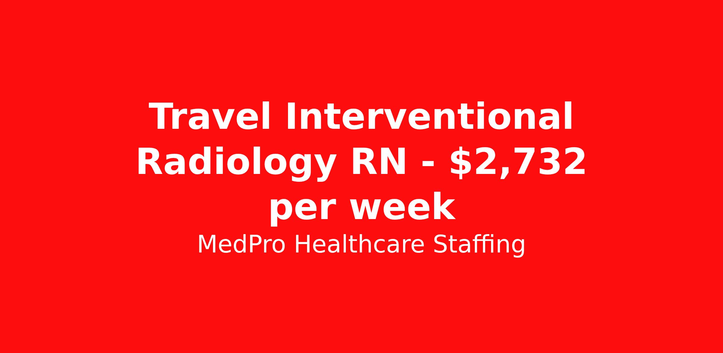 MedPro Healthcare Staffing is seeking a travel nurse RN Interventional Radiology for a travel nursing job in Greenville, South Carolina. Job Description & Requirements Specialty: Interventional Radiology Discipline: RN Start Date: 04/13/2026 Duration: 13 weeks 40 hours per week Shift: 8 hours, days Employment Type: Travel MedPro Healthcare Staffing , a Joint Commission-certified staffing agency, is seeking a quality Interventional Radiology Tech for a contract with one of our top healthcare clients. Requirements Current License in good standing Appropriate specialty certifications/credentials Eighteen months of Special Procedures/Interventional experience preferred, ideally in a critical care setting. Other requirements to be determined by our client facility Benefits Weekly pay and direct deposit Full coverage of all credentialing fees Private housing or housing allowance Group Health insurance for you and your family Company-paid life and disability insurance Travel reimbursement 401(k) matching Unlimited Referral Bonuses up to $1,000 Duties Responsibilities The primary responsibility of the Interventional Radiology Tech is to provide assistance with patient care in the Interventional Radiology Department through the provision of technical assistance to the IR team. Perform diagnostic and interventional imaging procedures in a clinical setting. Operates conventional, fluoroscopic or radiology equipment to obtain images of designated body parts according to physician specifications and/or orders. Assists the physician with the performance of various diagnostic and interventional procedures, by monitoring, passing instruments and catheters, observing patient response to procedure, maintaining sterile field, interpreting and evaluating diagnostic data to be utilized by the physician. Assure compliance with federal, state, and local technical and professional regulations and accepted practiced guidelines. Delivers quality, cost effective patient care in a professional manner. Works effectively to maintain an environment of excellence, which is patient focused, providing timely, compassionate, quality patient care. Prepare and update patient records accurately and legibly. About Agency MedPro Healthcare Staffing is a Joint Commission certified provider of contract staffing services. Since 1983, we have placed nursing and allied travelers in top healthcare facilities nationwide. Join us today for your very own MedPro Experience®. MedPro Staffing is an Equal Opportunity Employer. All applicants will be considered for employment without attention to race, color, religion, national origin, age, sex, disability, marital status or veteran status. Key Words: Cath Lab Tech, CLT, Cardiac Catheter Lab Technician, Cardiac Catheterization, Cardiovascular Technologist, RCIS, EP Tech, Special Procedures Tech, Interventional Tech, Electrophysiology, Electrophysiology Tech, IR Tech *Weekly payment estimates are intended for informational purposes only and include a gross estimate of hourly wages and reimbursements for meal, incidental, and housing expenses. Your recruiter will confirm your eligibility and provide additional details. MedPro Job ID a0Fcx00000FZbP4EAL. Pay package is based on 8 hour shifts and 40 hours per week (subject to confirmation) with tax-free stipend amount to be determined. Posted job title: Imaging: Interventional Radiology Technologist Imaging: Interventional Radiology Technologist. About MedPro Healthcare Staffing At MedPro Healthcare Staffing , we believe no one cares more for caregivers than we do. Our mission is simple: you focus on your patients, and we’ll take care of the rest. As a Joint Commission-certified leader in temporary and contract healthcare staffing since 1983, MedPro has proudly connected nursing and allied travelers with top healthcare facilities across the nation. With thousands of job opportunities available nationwide, we make it easy to find assignments that align with your goals and lifestyle. Our on-staff clinical support team—alongside a compassionate group of experienced recruiters—provides hands-on guidance every step of the way. From Day 1 medical benefits and a 401(k) plan to personalized career support, we’re committed to ensuring every professional we serve feels valued, cared for, and empowered to succeed. Guided by a CEO who is a Registered Nurse, MedPro is built on a foundation of clinical insight and genuine compassion for the caregiving community. Through The MedPro Experience® , we deliver travel assignments that are rewarding, memorable, and designed to help you DREAM big, EXPLORE often, and ACHIEVE greatness. Benefits Day 1 medical, dental, and vision benefits for you and your family Weekly pay and direct deposit Unlimited Referral Bonuses starting at $500 On Staff Clinical Support Team Access to nationwide travel assignments MPX Mobile app -24/7 real-time access to jobs, credentials, assignment details, and more Full coverage of all credentialing fees Private housing or housing allowance Tax Free Per Diems, Housing Stipends and Travel Reimbursements Company-paid life and disability insurance Travel reimbursement 401(k) matching Benefits Weekly pay Referral bonus Employee assistance programs