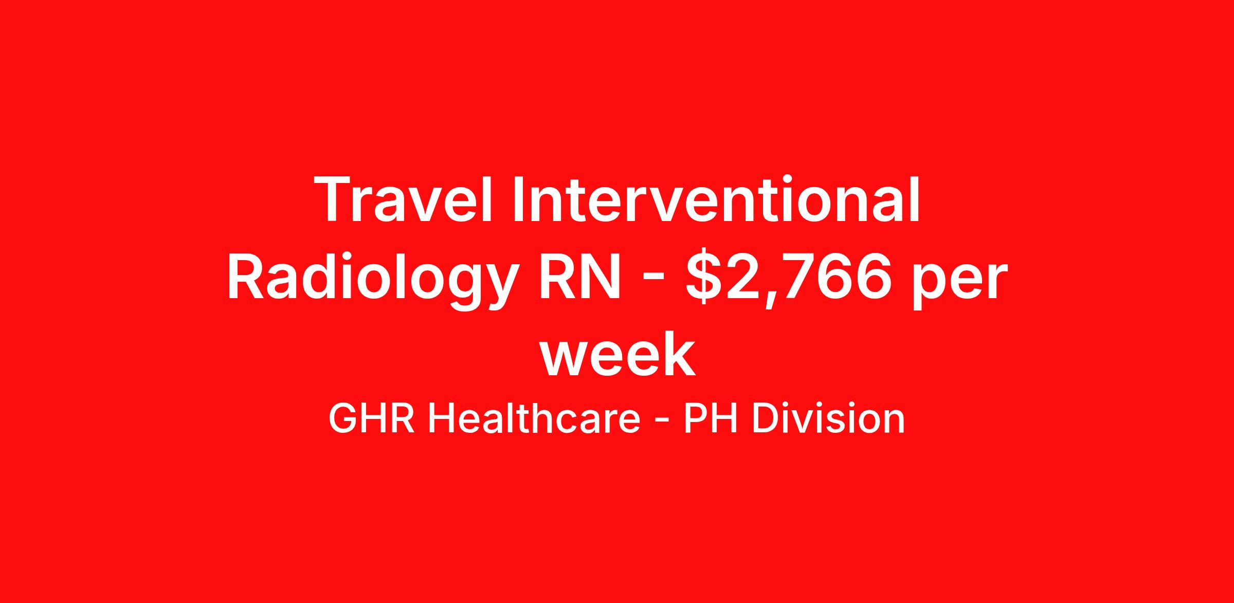 GHR Healthcare - PH Division is seeking a travel nurse RN Interventional Radiology for a travel nursing job in Peoria, Illinois. Job Description & Requirements Specialty: Interventional Radiology Discipline: RN Start Date: ASAP Duration: 13 weeks 36 hours per week Shift: 12 hours Employment Type: Travel Planet Healthcare Job ID 75196927. Pay package is based on 12 hour shifts and 36 hours per week (subject to confirmation) with tax-free stipend amount to be determined. About GHR Healthcare - PH Division For over 30 years, GHR Healthcare has been the bridge between healthcare professionals and the facilities that need them nationwide. We're committed to uncovering your ideal fit, supported by GHR's dedication to competitive compensation, transparent communication, and a devoted team that genuinely cares about your career journey. You can trust us to stand by your side as your advocate, confidante, and partner in advancing your career. At GHR, care and consideration are at the heart of everything we do. Visit ghrhealthcare.com to learn more.
