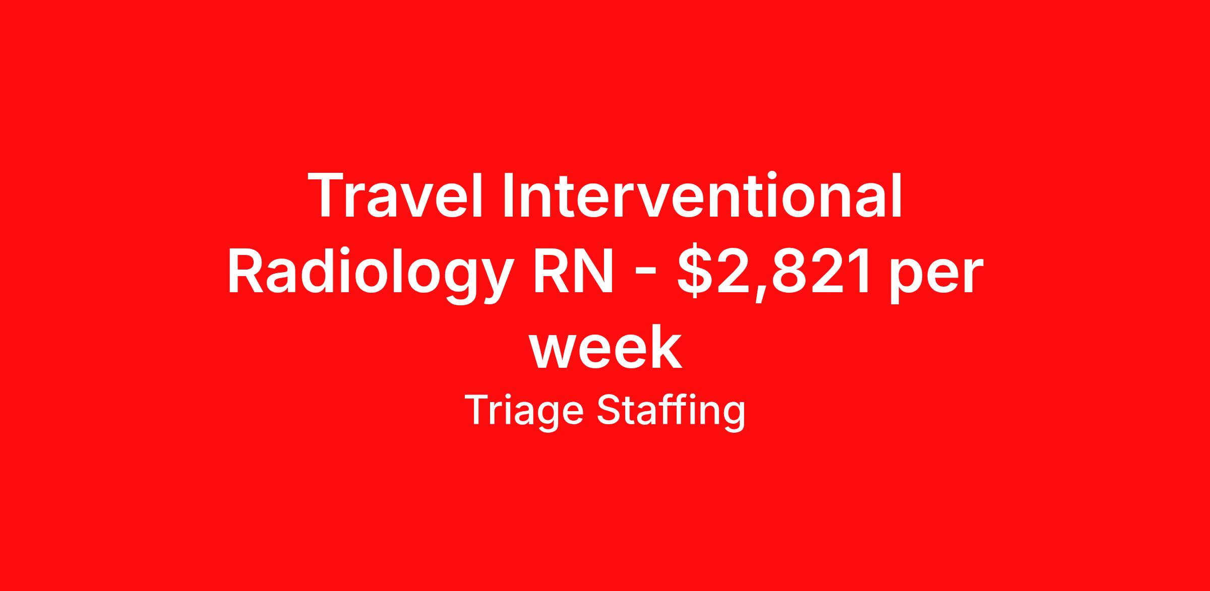 Triage Staffing is seeking a travel nurse RN Interventional Radiology for a travel nursing job in Hermiston, Oregon. Job Description & Requirements Specialty: Interventional Radiology Discipline: RN Start Date: ASAP Duration: 13 weeks 40 hours per week Shift: 8 hours, flexible Employment Type: Travel Travel Nursing: Interventional Radiology Hermiston, OR Location: Hermiston, OR Start Date: 1/31/2026 Shift Details: 8H Variable 40 hours per week Length: 13 WEEKS Apply for specific facility details.IR/Specials RN Triage Staffing Job ID L9739AEU. Posted job title: Nursing: Interventional Radiology About Triage Staffing At Triage, we prefer to be real . Real about expectations—both ours and yours. Real about how a decision you make today could affect your tomorrows. Real about how compensation actually works. Real about how great—or grating—your next supervisor may be. Being real allows everyone at Triage to be ready . Ready to serve you with real honesty. So if that gig near the ocean is really no day at the beach, or that third shift comes with a second-class rate, we tell you. So you can be ready, too. We staff all five major divisions of acute care—nursing, lab, radiology, cardiopulmonary and rehab therapy, offering: - Competitive, custom pay packages - One point of contact for both travelers and facilities (per division) - A reliable recruiter who's got your back throughout your entire assignment - In-house compliance and accounting specialists - A clinical liaison team available 24/7 to offer medical and professional support and career development - A mentoring program that is run and managed by actual clinicians—yeah, you read that right - And more (because of course there’s more) Are we the biggest? No. Are we the best? That’s rather subjective, but we’re trying to be. Will we work like hell to get you as close to your idea of heaven as possible? Yes. Yes, we will. Benefits: Day One comprehensive, nationwide insurance plans for health, vision and dental and life—including a HSA option Day One 401(k) program with employer-matching contributions once eligible Facility cancelling protection—your time is money on and off-the-clock Guaranteed hours Weekly paychecks via direct deposit Earned vacation bonuses for time worked Paid holidays Employee assistance program (EAP)—your mental health is important, too Continuing education, certification and licensing reimbursement Workers comp—because accidents happen Top-rated professional liability insurance Company provided housing options Referral bonus—$750 in your pocket after they’ve completed a 13-week assignment