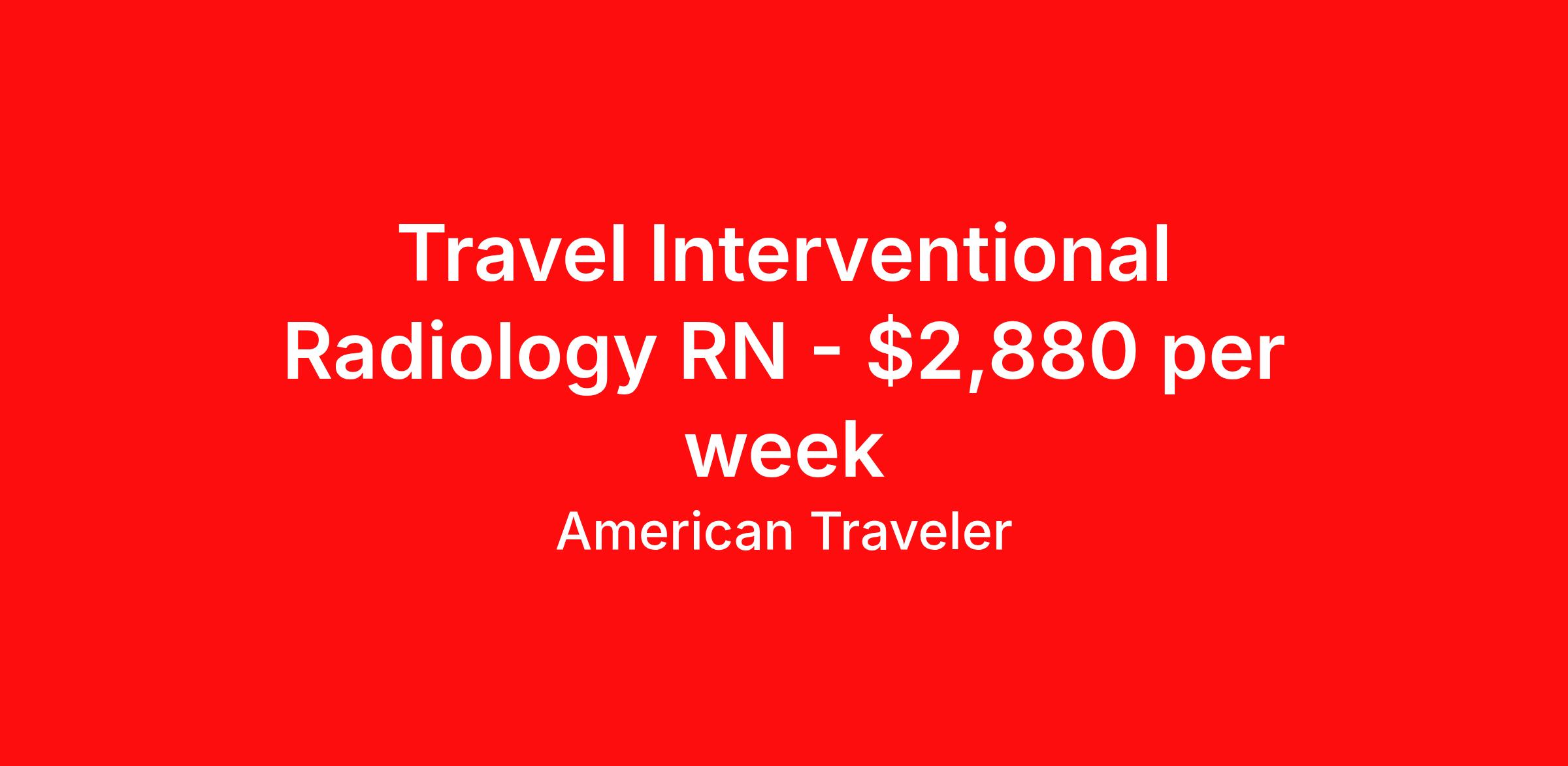 American Traveler is seeking a travel nurse RN Interventional Radiology for a travel nursing job in Keene, New Hampshire. Job Description & Requirements Specialty: Interventional Radiology Discipline: RN Start Date: 03/30/2026 Duration: 13 weeks 40 hours per week Shift: 10 hours, days Employment Type: Travel Assignment Overview Shift: Days, 4x10hrs Hours: 40 hrs/wk Start Date: Mar 30, 2026 Length: 13 weeks Openings: 1 Description American Traveler is hiring an experienced RN for an Interventional Radiology position in New Hampshire, requiring ACLS certification and recent Level 1 or comparable Level 2 Trauma experience. Details Work within a hospital Radiology Department serving both inpatient and outpatient populations Covers multiple imaging modalities including Diagnostic Radiology, Fluoroscopy, CT, Ultrasound, Nuclear Medicine, Mammography, and MRI Two shift options available: Days 8:00 AM–6:30 PM (Tue–Fri) or Days 7:00 AM–5:30 PM (Mon, Tue, Thu, Fri) Requirements Active NH or Compact RN license currently in hand Current certifications: BLS and ACLS required Interventional Radiology (IR) experience strongly preferred Radiology nursing experience preferred; critical care experience preferred Recent Level 1 or comparable Level 2 Trauma experience within the last 2 years required Graduate of an accredited nursing program Two manager references required for consideration Additional Information Deliver nursing care to patients undergoing radiologic procedures, ensuring safety and comfort throughout Assist in administering sedation while closely monitoring patient responses and vital signs Respond to emergency situations including contrast reactions and procedural complications Collaborate with radiologists, technologists, and multidisciplinary teams to ensure seamless patient care Candidates must reside more than 75 miles from the facility — local candidates are not eligible for this position American Traveler Job ID P-680088. Pay package is based on 10 hour shifts and 40 hours per week (subject to confirmation) with tax-free stipend amount to be determined. Posted job title: Travel RN - Interventional Radiology/IR - Interventional Radiology About American Traveler With over 25 years of experience, American Traveler has established a reputation for outstanding customer service. Our team ensures a smooth, worry-free experience for those starting on or expanding their travel nursing and allied careers. With thousands of travel nursing and allied jobs nationwide, our attentive and approachable recruiters find positions that align perfectly with your career aspirations and personal requirements. American Traveler offers exceptional benefits, including premium medical, dental, vision and life insurance beginning day one of your assignment, generous 401(k) match, substantial housing stipends, and more. Additionally, with 24/7 support and access to our in-house clinicians, you are assured confidence and comfort throughout your assignment. With our team behind you, you can relax and enjoy a rewarding travel career.