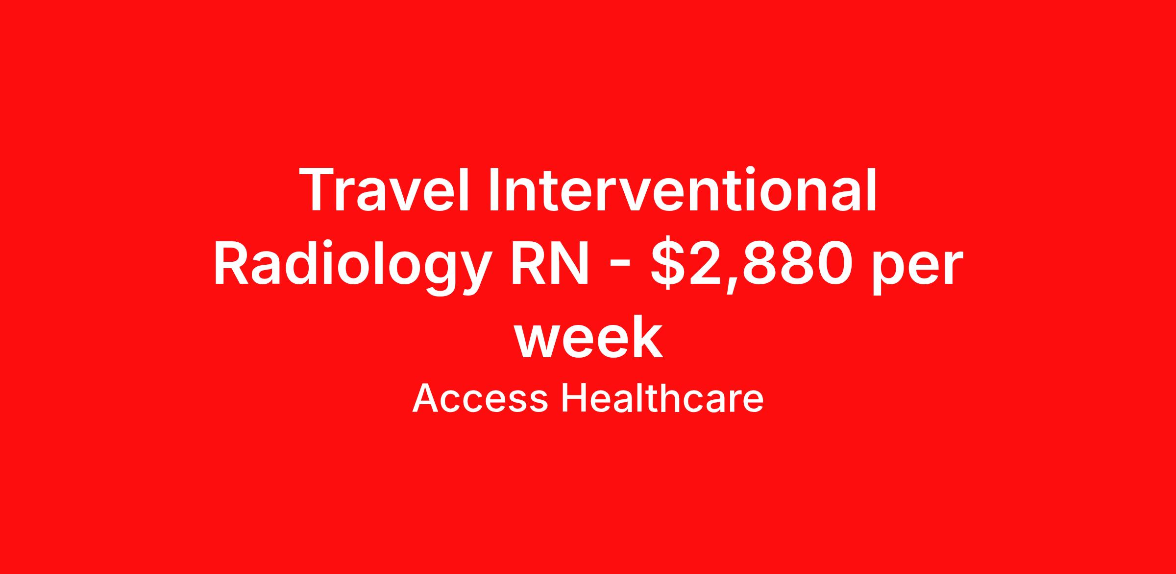 Access Healthcare is seeking a travel nurse RN Interventional Radiology for a travel nursing job in Columbia, South Carolina. Job Description & Requirements Specialty: Interventional Radiology Discipline: RN Start Date: 04/13/2026 Duration: 13 weeks 40 hours per week Shift: 8 hours, days Employment Type: Travel Access Healthcare Job ID 75868949. Pay package is based on 8 hour shifts and 40 hours per week (subject to confirmation) with tax-free stipend amount to be determined. About Access Healthcare Access Healthcare aims to provide superior service to our nursing family by providing around the clock support, competitive pay packages and an unmatched benefits package! Unlike other agencies, we offer a true family feel and work with you to find the placement that is right for you. We offer one of the top leading pay packages in the industry and we are ready to get you the money you deserve! Access Healthcare was founded by two travel nurses, Danielle and Diego, who had a dream and a shared vision of creating an agency which all nurses would want to work with. Our passion has led us to where we are today as one of the top 10 agencies in our home state of New Jersey, with access to contracts in all 50 states! We encourage you to join our team and we cannot wait to get to know you!