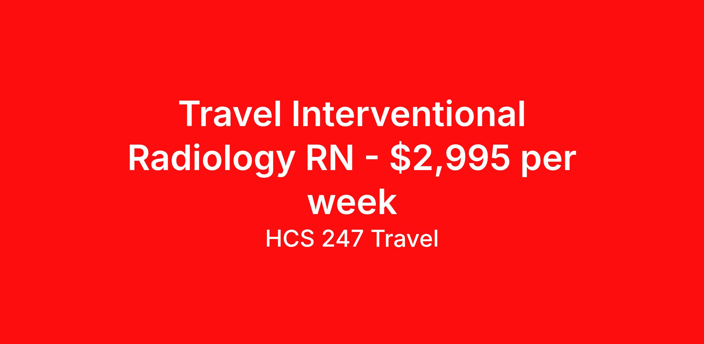 HCS 247 Travel is seeking a travel nurse RN Interventional Radiology for a travel nursing job in Cleveland, Ohio. Job Description & Requirements Specialty: Interventional Radiology Discipline: RN Start Date: 04/20/2026 Duration: 12 weeks 40 hours per week Shift: 10 hours, days Employment Type: Travel HCS 247 Travel Job ID 62291219. Pay package is based on 10 hour shifts and 40 hours per week (subject to confirmation) with tax-free stipend amount to be determined. About HCS 247 Travel HCS 24/7 is a national healthcare staffing organization specializing in the placement of Registered Nurses and Allied health professionals across acute care and other clinical settings. We support travel assignments, local short- and long-term contracts, per diem, temp-to-perm, and direct hire opportunities nationwide. Our clinical coverage includes Registered Nurse specialties such as ER, ICU, Med-Surg, Telemetry, Step-Down, OR, PACU, L&D, Mother/Baby, NICU, Cath Lab, Endoscopy, and more along with a full range of allied and imaging professionals, including Respiratory Therapists, Surgical Technicians, X-Ray Techs, CT Techs, MRI Techs, Interventional Radiology (IR) Techs, Cath Lab Techs, Ultrasound/Sonographers, Mammography Techs, and Nuclear Medicine Techs. With competitive compensation and benefits, consistent opportunities, and a clinician-first approach backed by top-rated customer service, HCS 24/7 delivers a seamless experience from initial application through assignment completion. Benefits Holiday Pay Guaranteed Hours Continuing Education Mileage reimbursement Referral bonus Medical benefits Dental benefits Vision benefits License and certification reimbursement Life insurance Benefits start day 1 Weekly pay
