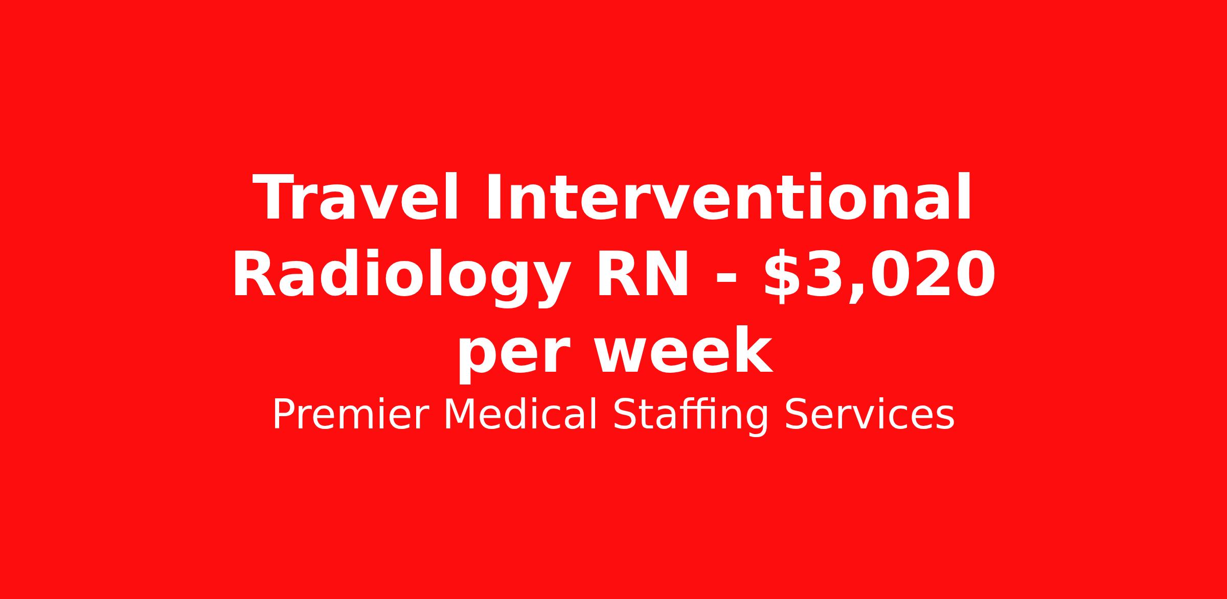 Premier Medical Staffing Services is seeking a travel nurse RN Interventional Radiology for a travel nursing job in Hermiston, Oregon. Job Description & Requirements Specialty: Interventional Radiology Discipline: RN Start Date: ASAP Duration: 13 weeks 40 hours per week Shift: 8 hours Employment Type: Travel Premier Medical Staffing Job ID 617906. Pay package is based on 8 hour shifts and 40 hours per week (subject to confirmation) with tax-free stipend amount to be determined. Posted job title: RN Interventional Radiology About Premier Medical Staffing Services Premier Medical Staffing Services, LLC is a nationally expanding healthcare staffing firm for healthcare professionals and companies. We understand our clients’ need for highly qualified, expertly trained medical professionals and are passionate about helping clinicians find employment opportunities that fit their personality and needs. Able to accommodate the ever-changing needs of the healthcare landscape, we offer per-diem, contract and direct hire placements to support the unique needs of each industry sector. Premier Medical Staffing Services is Joint Commission Certified, a Military Spouse Employment Partner and is certified as a Women’s Business Enterprise. We are proudly nurse owned.