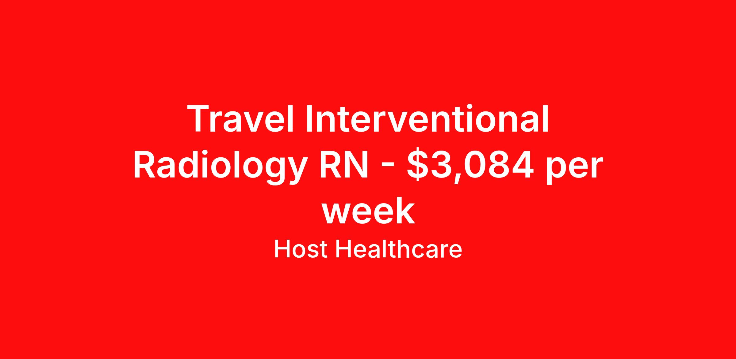Host Healthcare is seeking a travel nurse RN Interventional Radiology for a travel nursing job in Pittsfield, Massachusetts. Job Description & Requirements Specialty: Interventional Radiology Discipline: RN Start Date: 04/06/2026 Duration: 13 weeks 40 hours per week Shift: 8 hours, days Employment Type: Travel Host Healthcare Job ID a1fVX000002wNEPYA2. Pay package is based on 8 hour shifts and 40 hours per week (subject to confirmation) with tax-free stipend amount to be determined. Posted job title: RN - Interventional Radiology About Host Healthcare At Host Healthcare, we provide a truly comfortable experience as you explore your travel nursing, therapy, or allied career. We make your travel healthcare journey easy by taking care of all the details, so you don’t have to. We are on a mission to help others live better and we do this by helping the healers of the world be as comfortable as possible. With access to tens of thousands of travel nursing, therapy, and allied jobs in all 50 states, our responsive and friendly recruiters find your dream position based on what’s important to you. During your assignment, get access to premium benefits, including Day 1 medical that continues up to 30 days between assignments, 401K matching, travel reimbursements, dedicated housing support, and more. We also offer 24/7 support from our team and access to our on-staff clinicians so you can feel comfortable and confident throughout your entire assignment. Travel comfortably with Host Healthcare. Benefits Referral bonus School loan reimbursement Vision benefits Wellness and fitness programs Company provided housing options License and certification reimbursement Life insurance Medical benefits Mileage reimbursement Pet insurance Discount program Employee assistance programs Guaranteed Hours Health savings account Holiday Pay 401k retirement plan Continuing Education Dental benefits