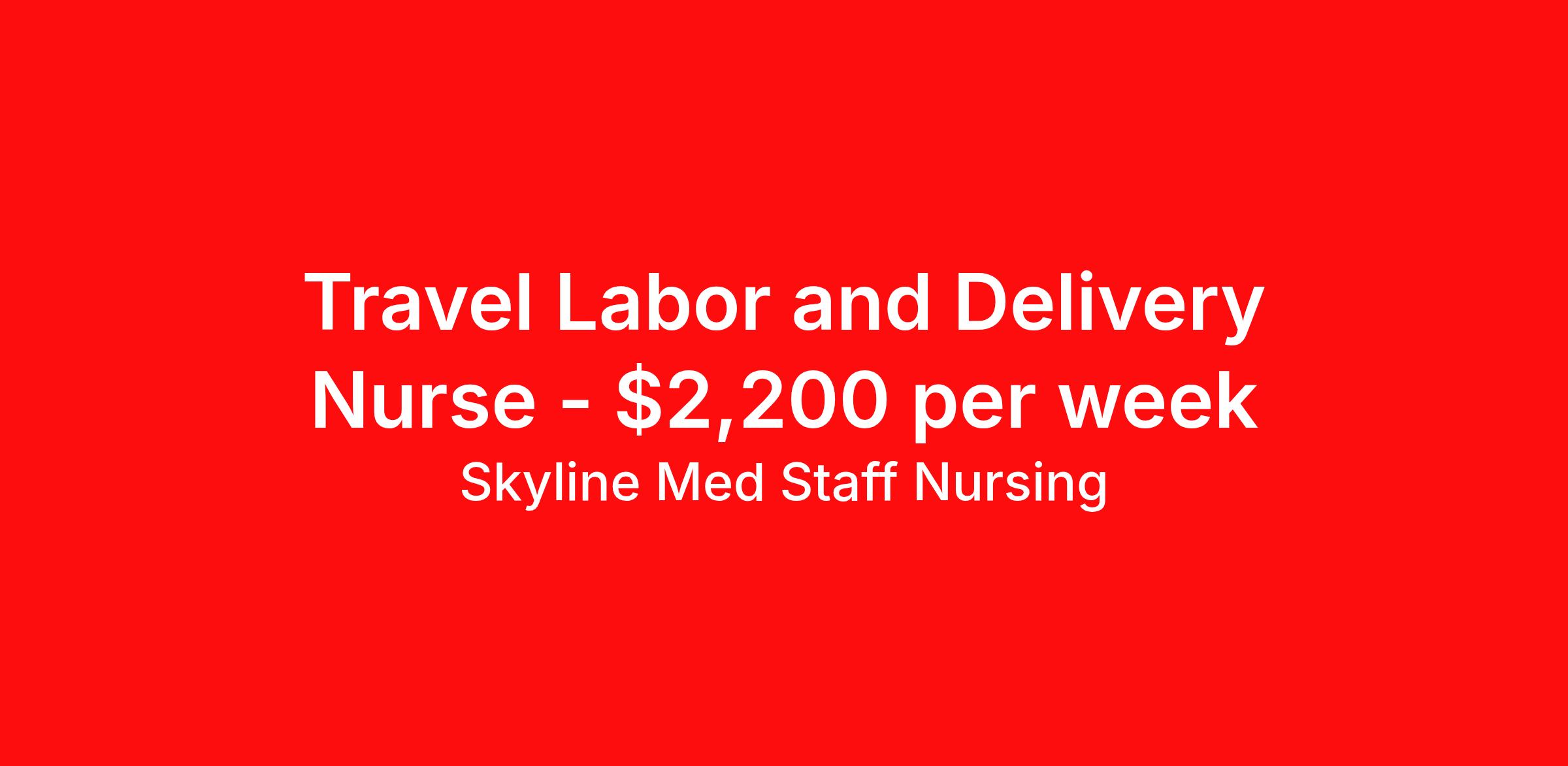Skyline Med Staff Nursing is seeking a travel nurse RN Labor and Delivery for a travel nursing job in Liberal, Kansas. Job Description & Requirements Specialty: Labor and Delivery Discipline: RN Start Date: 05/18/2026 Duration: 13 weeks 36 hours per week Shift: 12 hours, days Employment Type: Travel Weekly amount stated in job postings is an estimate based on estimated hourly wage and potential stipends available for the location of the assignment. Pay package is calculated on bill rate at the time job was posted, but can change or vary without notice. Exact pay packages might vary as this is an estimate. Our recruiter would be happy to build an exact pay package for you for each job. Skyline Med Staff Nursing Job ID 36496027. Pay package is based on 12 hour shifts and 36.0 hours per week (subject to confirmation) with tax-free stipend amount to be determined. Posted job title: RN:L&D,07:00:00-19:00:00 About Skyline Med Staff Nursing Join the Top- Rated Travel Healthcare Team! Skyline Med Staff was named as the 1 Best Travel Healthcare Company in 2025 by BluePipes, a recognition driven by glowing reviews from travel healthcare professionals. Our recruiters are consistently praised on Google for their responsiveness, dedication, accessibility, and industry knowledge. Ready to experience the difference? Apply for a job today and see why healthcare professionals choose Skyline! Certified Women Owned Business We believe that travel is good for the soul. We want to be on your journey with you and find the right job that fits you Skyline Med Staff is committed to one vision treating others the way that THEY want to be treated. The executive team at Skyline Med Staff focuses on a commitment to quality, consistency, and the highest level of service. Our team members continually strive to build long term relationships that center on you and helping you achieve your goals. Some of the Benefits you will receive with Skyline Med Staff: Over 30 years of combined experience in the staffing industry Higher Take-Home Pay Rates Dedicated Personal Recruiter We are available to you 24/7 Health Insurance Plan Options Tax Free Per Diems, Housing Stipends and Travel Reimbursements Joint Commission Certified Contracts in all 50 states Referral and Loyalty Bonuses Benefits Medical benefits Referral bonus