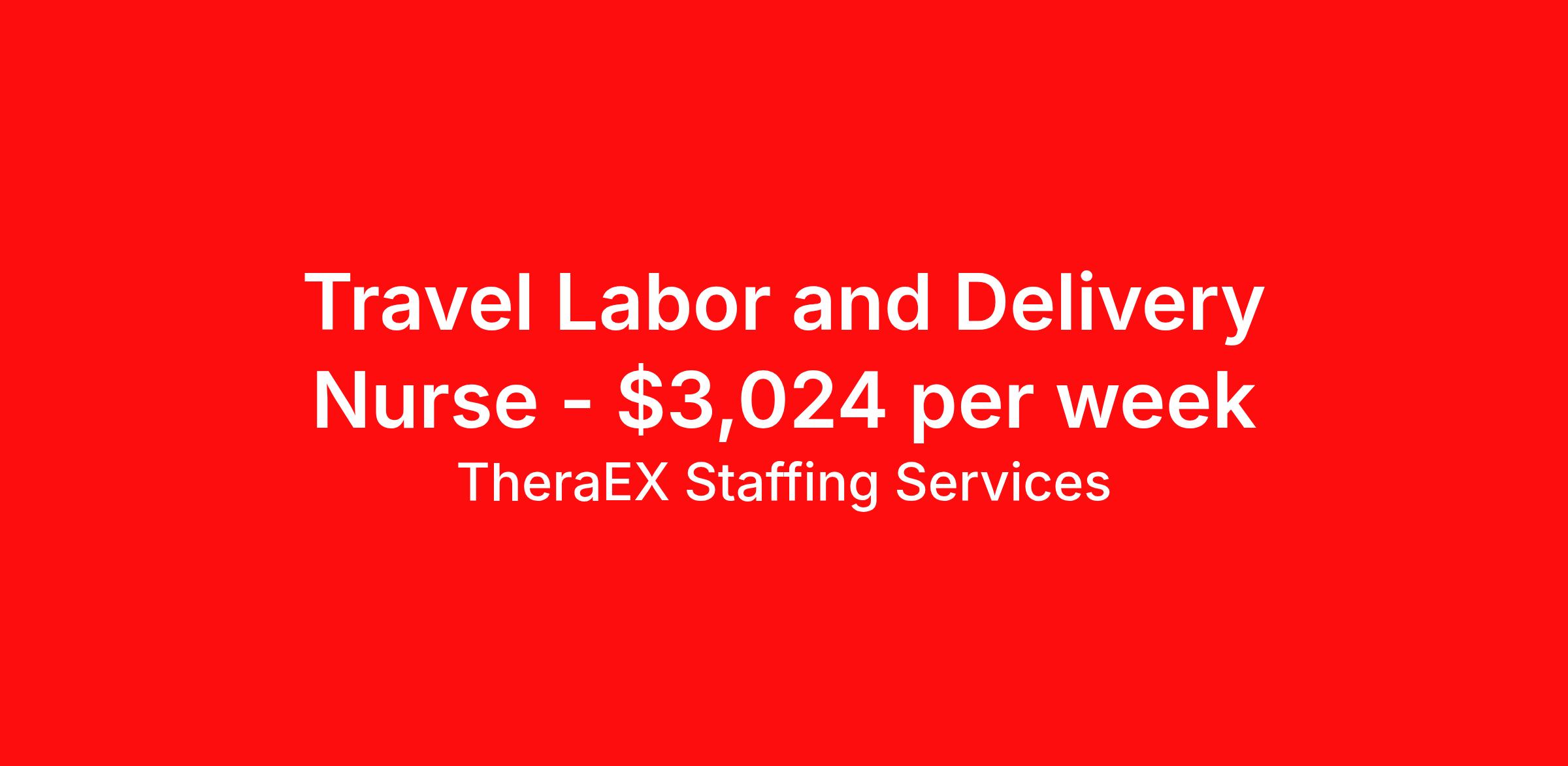 TheraEX Staffing Services is seeking a travel nurse RN Labor and Delivery for a travel nursing job in Lakeview, Oregon. Job Description & Requirements Specialty: Labor and Delivery Discipline: RN Duration: 13 weeks 36 hours per week Shift: 12 hours, days, nights, rotating Employment Type: Travel Minimum 2 years experience in Obstetrics and Labor & Delivery required; experience with Pediatrics or Telemetry preferred Certifications: ACLS, BLS, NRP, and AWHONN Intermediate Fetal Monitoring required; BSN not required / Skills: Proficiency in Cerner (CPSI) EMR; ability to work with a variety of patient types in a rural setting / Schedule: Day/Night Rotate; 12-hour shifts; 36 hrs/week/ PAY NEGOTIABLE TheraEX Staffing Services Job ID 1033184. Pay package is based on 12 hour shifts and 36 hours per week (subject to confirmation) with tax-free stipend amount to be determined. About TheraEX Staffing Services TheraEx Staffing Services is a leading name in healthcare staffing solutions. We enroll talented professionals to provide temporary staff to fill the needs of healthcare facilities across the nation. Benefits Dental benefits Vision benefits 401k retirement plan Health Care FSA Life insurance Sick pay Holiday Pay Medical benefits